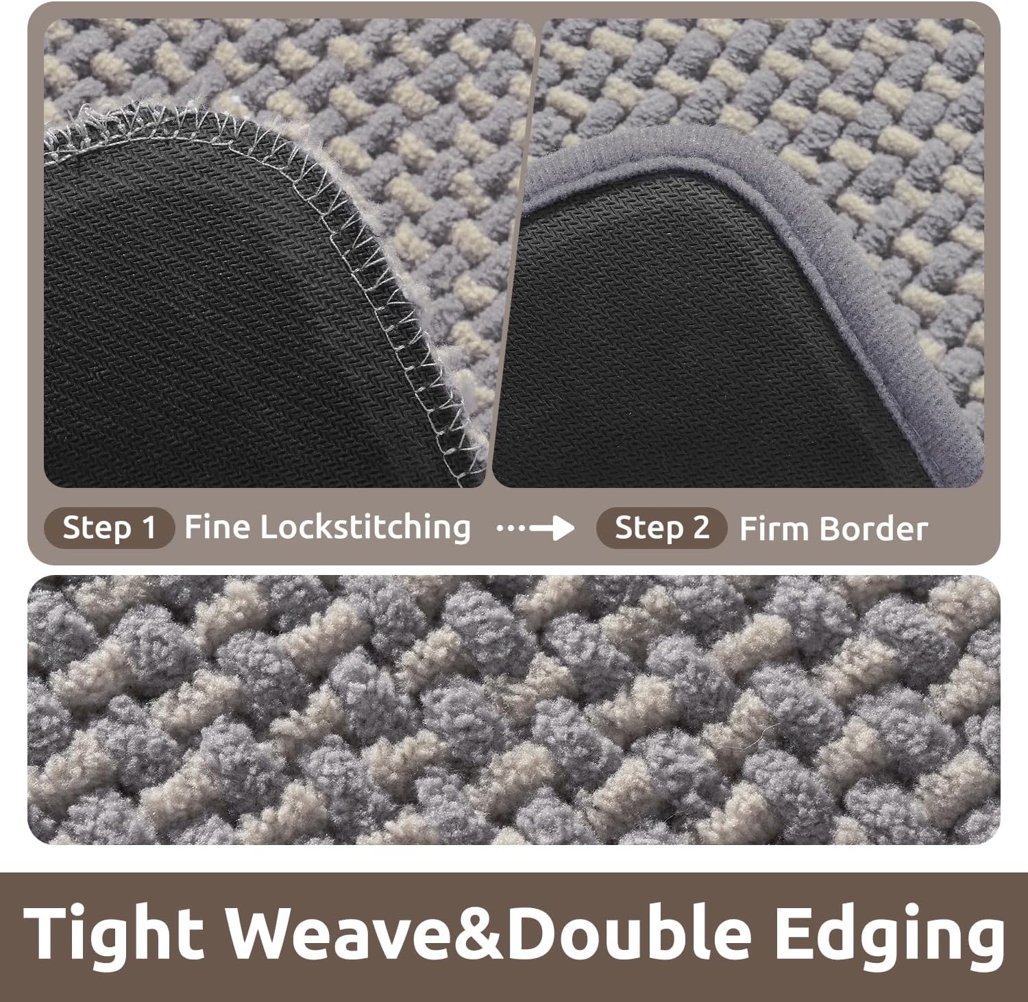 - [Update Double Edge & Color] Tightly woven bathroom runner with double locking edge process makes bathroom runner rug more stable, not easily dispersed, more robust than most of others chenile bathroom rugs. Stylish two-color design versatile, light and cozy chenille bathmat makes your feet feel cozy and relaxed.