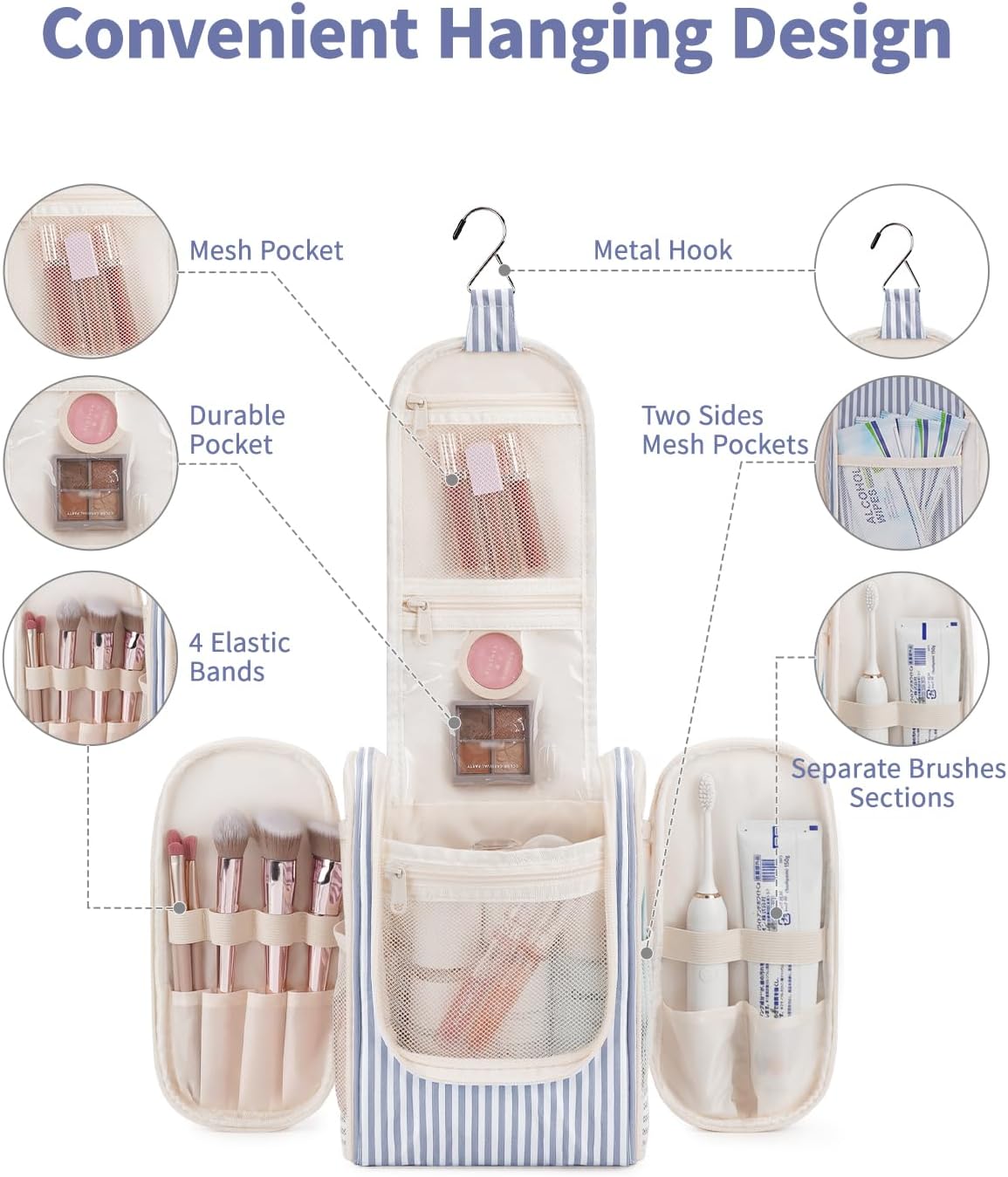 - DETAILS ORIENTED - Buit-in large metal hook allows hanging the toiletry case from towel rack, coat hook or whereever is available, making your toiletries and cosmetics displayed well for easy access, saving bathroom counter space as well. Water-resistent and durable fabric protects your gear from spills. Soft fabric and reliable zippers. Wide opening and rectangle shape makes it easy to stand on its own