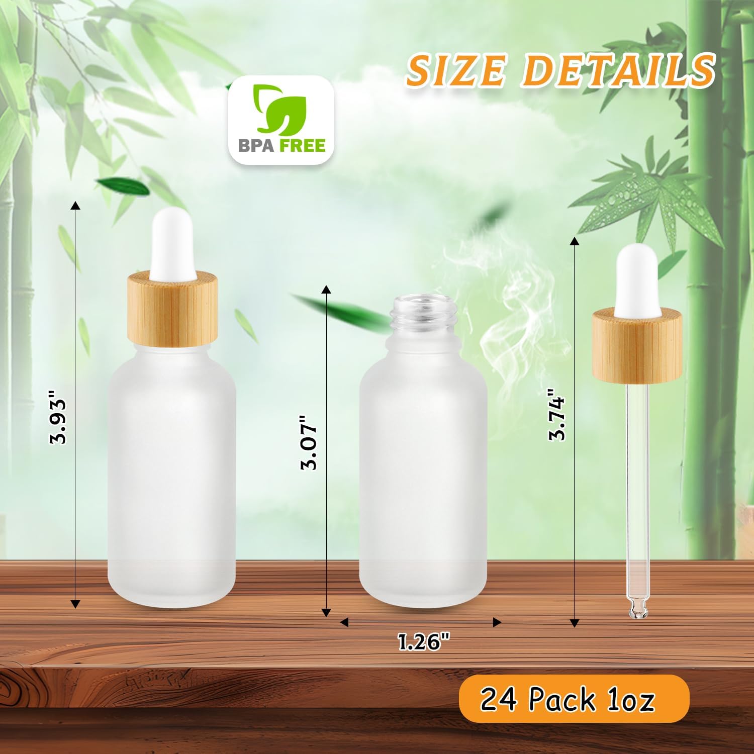 24 Pack 1 oz Frosted Glass Dropper Bottle,Empty Round Boston Travel Bottles With Eye Droppers,Natural Bamboo Dropper Cap for Essential Oils, Tinctures & Perfume,Facial Serums,Massage Oils