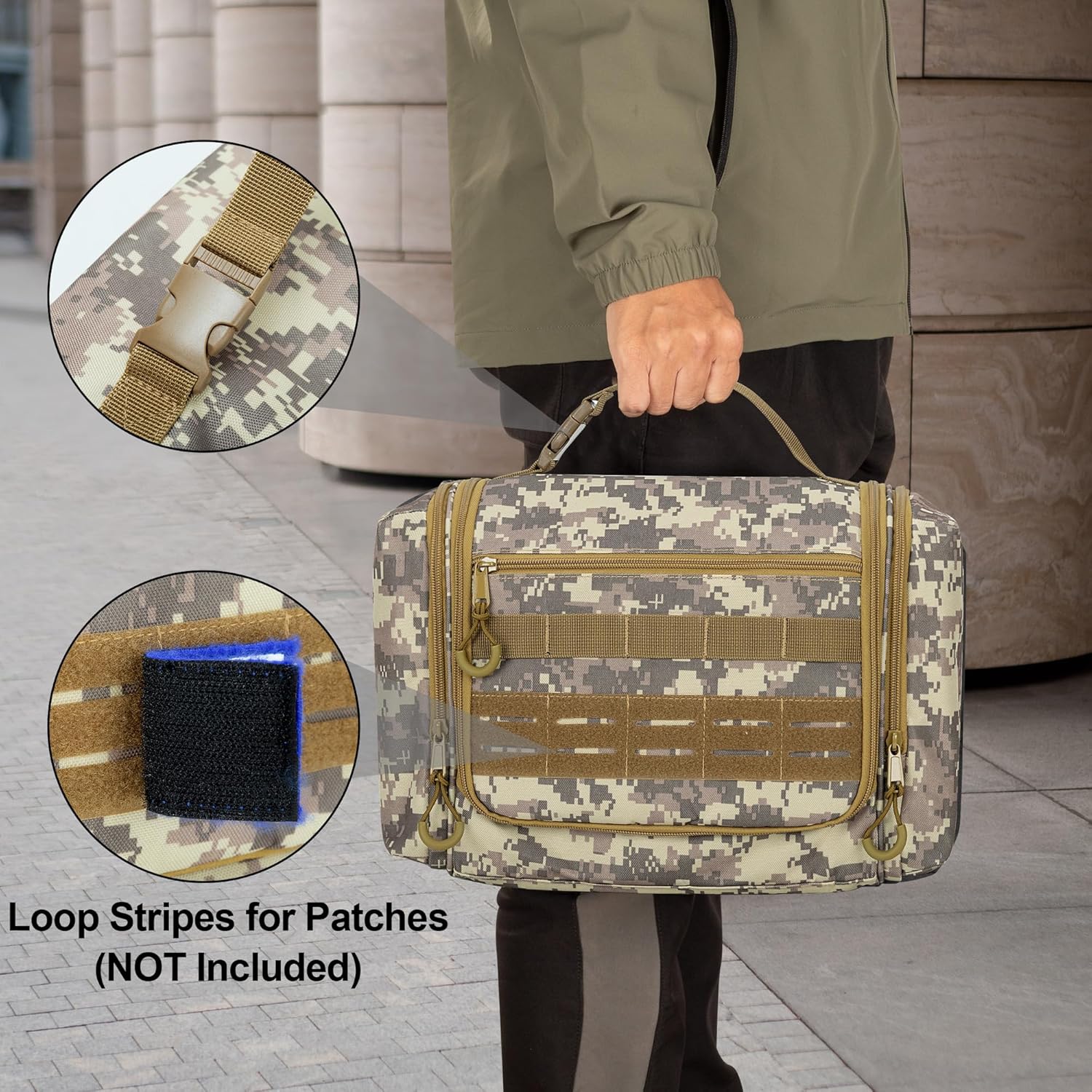 - CONVENIENT DESIGN: Front molle webbing design allows you to add tools or small pouches for additional capacity. And loop Stripes for attaching your exclusive patches. Dedicated dual-way zippers with orange handle ensure smooth opening. Front and back zipper pockets provide a quick access to your grooming products or emergency accessories.