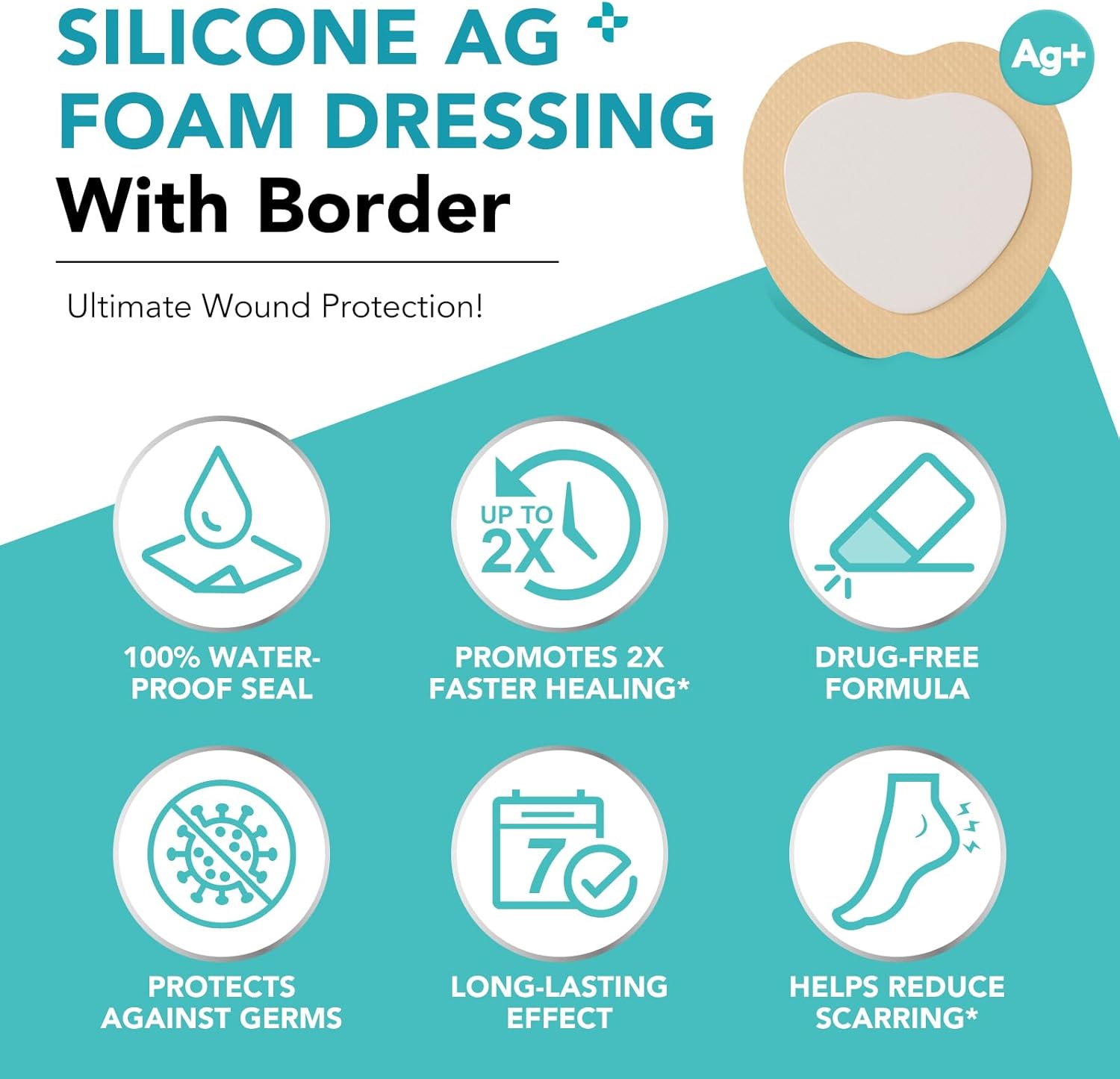 Silicone Foam Dressing Ag Sterile Wound Bandage with Waterproof Gentle Silicone Adhesive Border (5 Packs), 7"x 7" Breathable Ultra Absorbent Pads (7.08x7.08 Inch (Pack of 5))