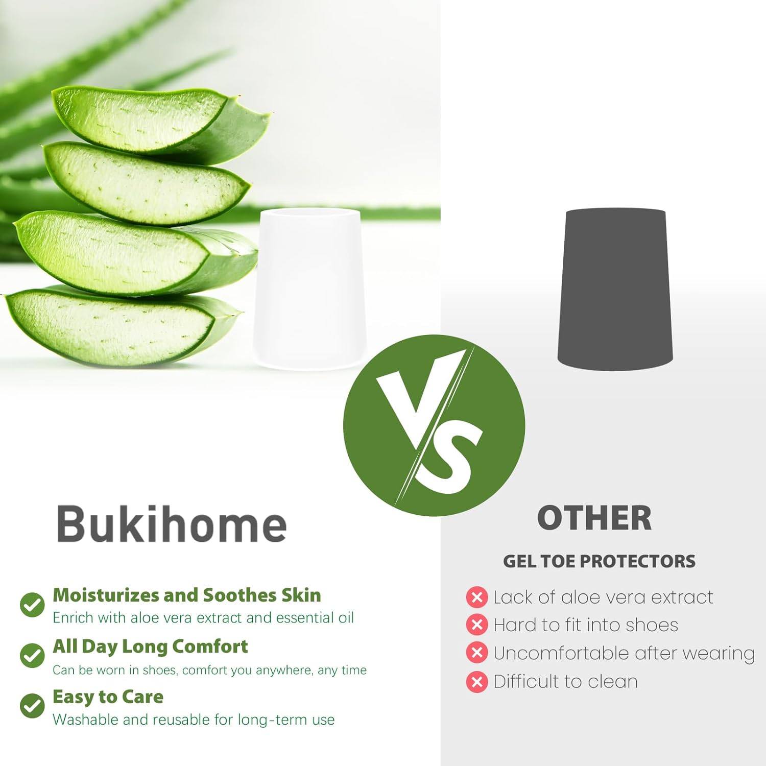 - Comfort Materials: Crafted from durable, high-quality gel, our soft and stretchable toe protectors are gentle on the skin yet incredibly durable. Enriched with aloe vera extract and mineral oil, they help alleviate pain and moisturize affected areas