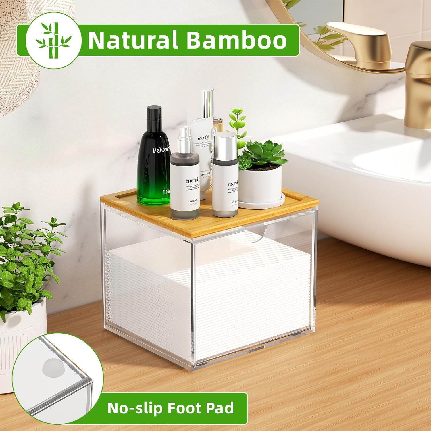- 【Elegant Acrylic and Bamboo】The disposable face towel holder features a combination of clear acrylic and bamboo. Offers a modern yet charming look, adding a touch of nature to your bathroom or vanity.