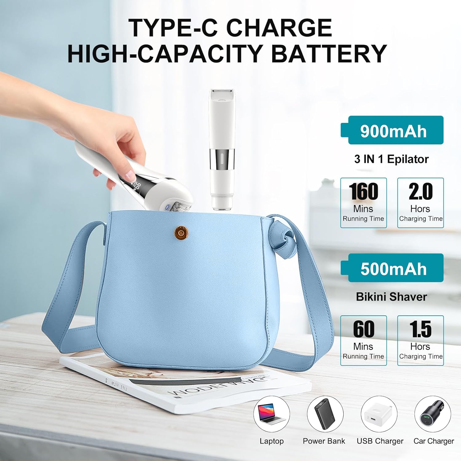 - Versatile 5-in-1 Design: Epilator,trimmer, callus remover, bikini trimmer, facial hair trimmer and cleansing brush all in one compact device for full-body hair removal and grooming.