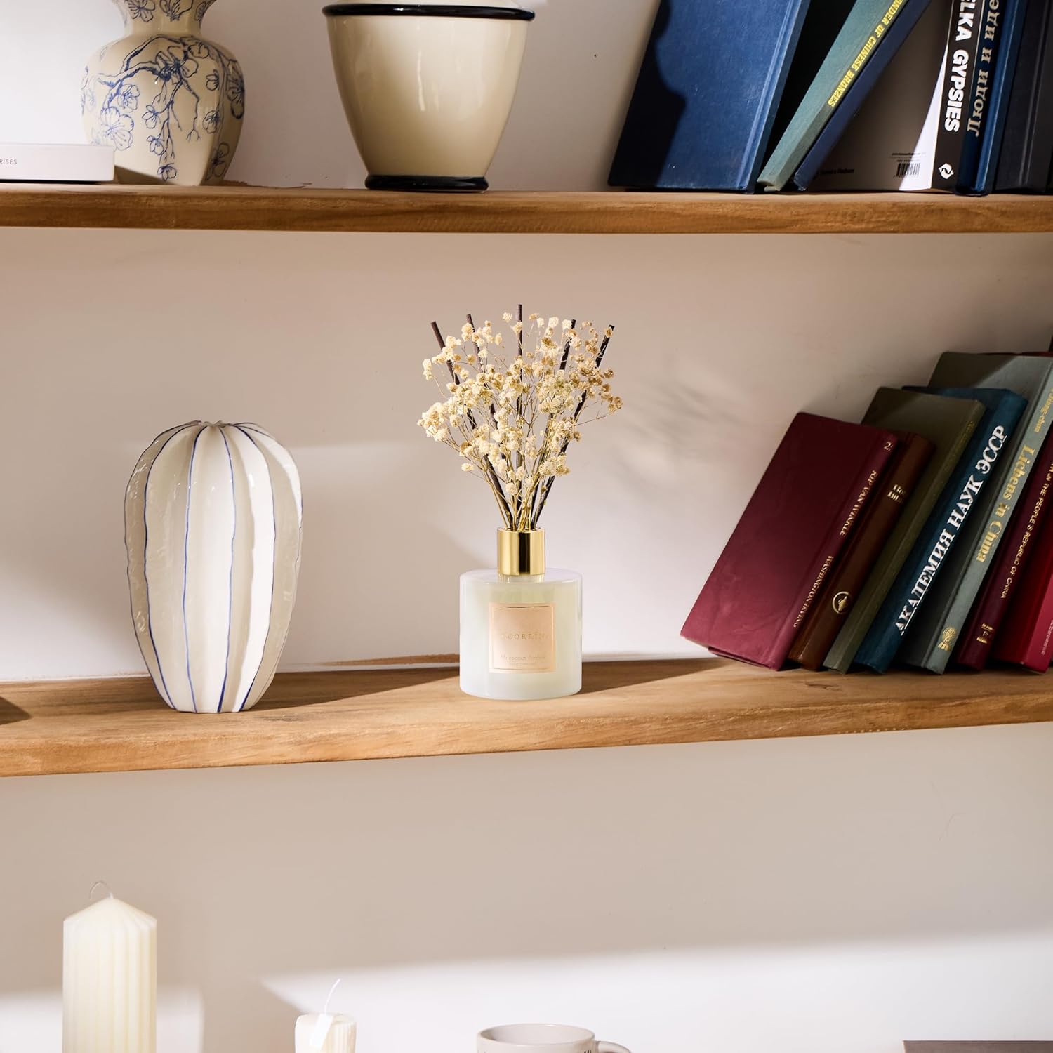 - Includes: One fragrance diffuser glass bottle, 6.76 fl oz mixture of essential oils combined with fragrance, one pc. of real preserved baby's breath flowers, and 8 pure cotton sticks. Adjust the amount of aroma released by adding or removing the sticks.