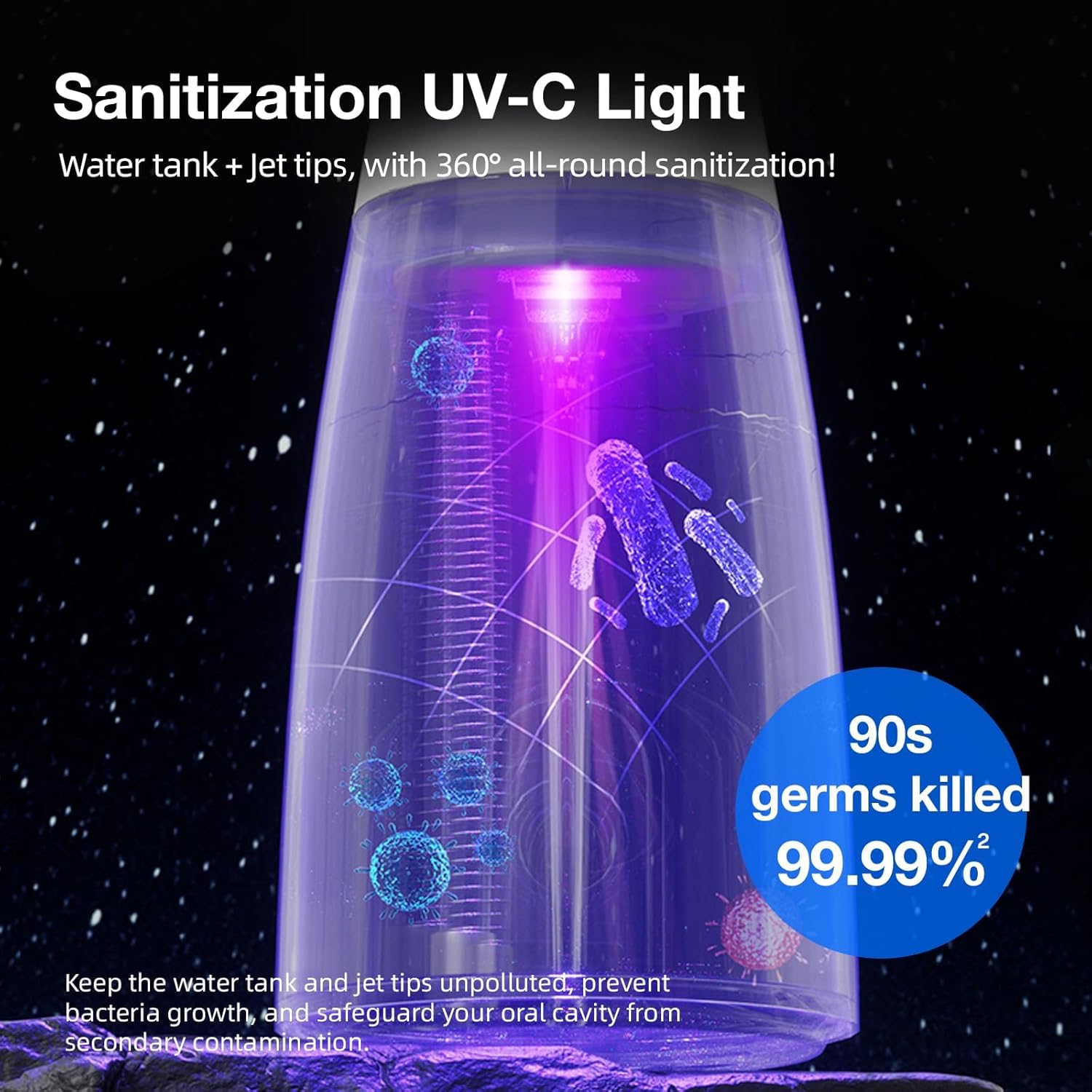 - Advanced UV-C Sanitization for Superior Hygiene β Built-in 360Β° UV-C light sterilizes the tank, pipes, and tips after every use, ensuring a clean and bacteria-free oral care routine. Smart 90-second timer for effective flossing every time.