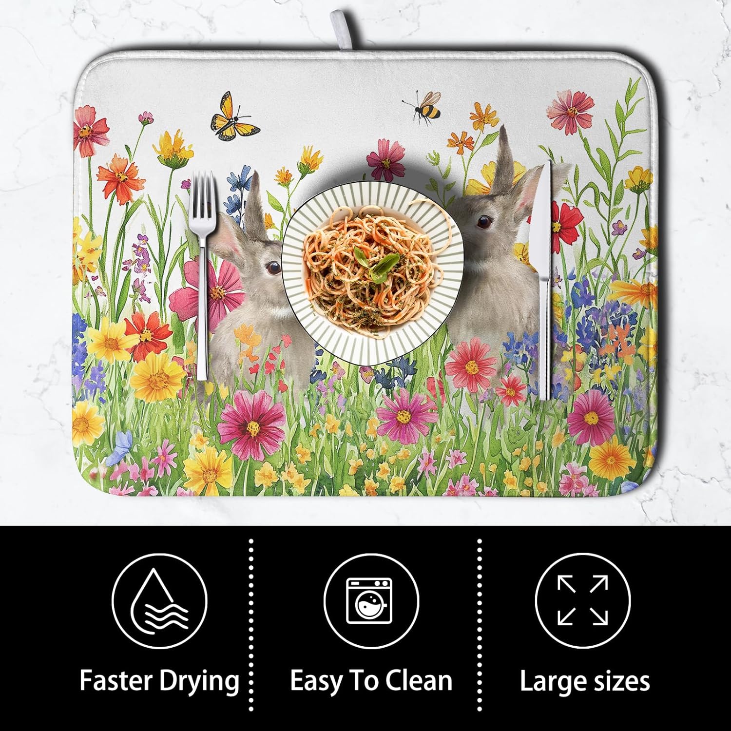Easter Dish Drying Mat for Kitchen Counter Easter Bunny Flowers Dish Drying Pad Spring Rabbit Floral Dishes Drainer Mats Absorbent Microfiber Kitchen Countertop Protector Drying Mats 16x18 in