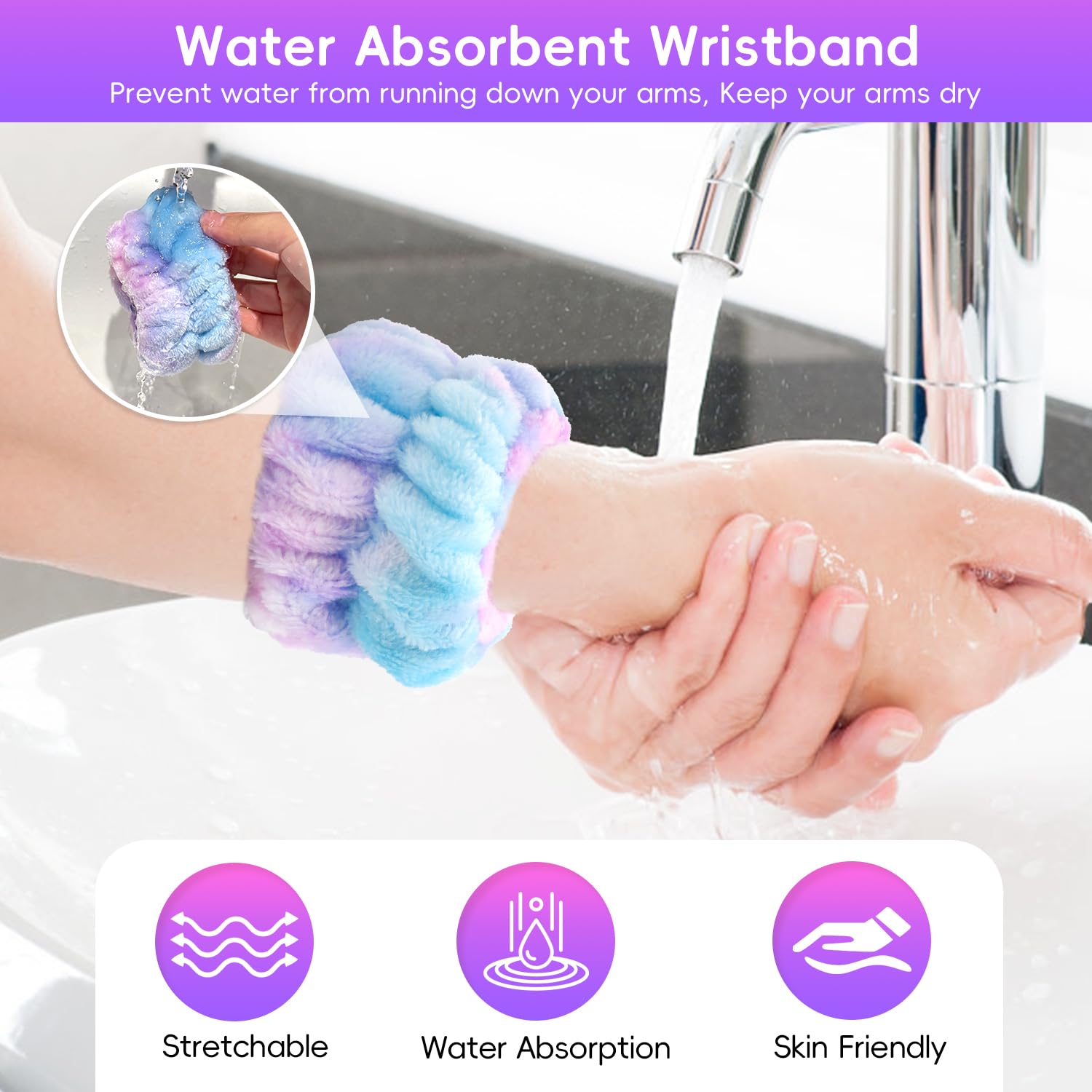 - 【Stay Dry, Enjoy Worry-Free Skin Care】The skincare headband and wristband set is the ideal companion for your daily skincare routine. The face-washing headband keeps the hairline dry, preventing annoying wet strands from sticking to your face. The accompanying face-washing wristbands are ingeniously designed to prevent water from flowing onto your arms and clothes. Whether it's face washing, applying a face mask, applying makeup, or daily use, the hair clips can hold your hair in place. Choose our face-washing headband and wristband set, no longer worrying about splashes wetting the bathroom.