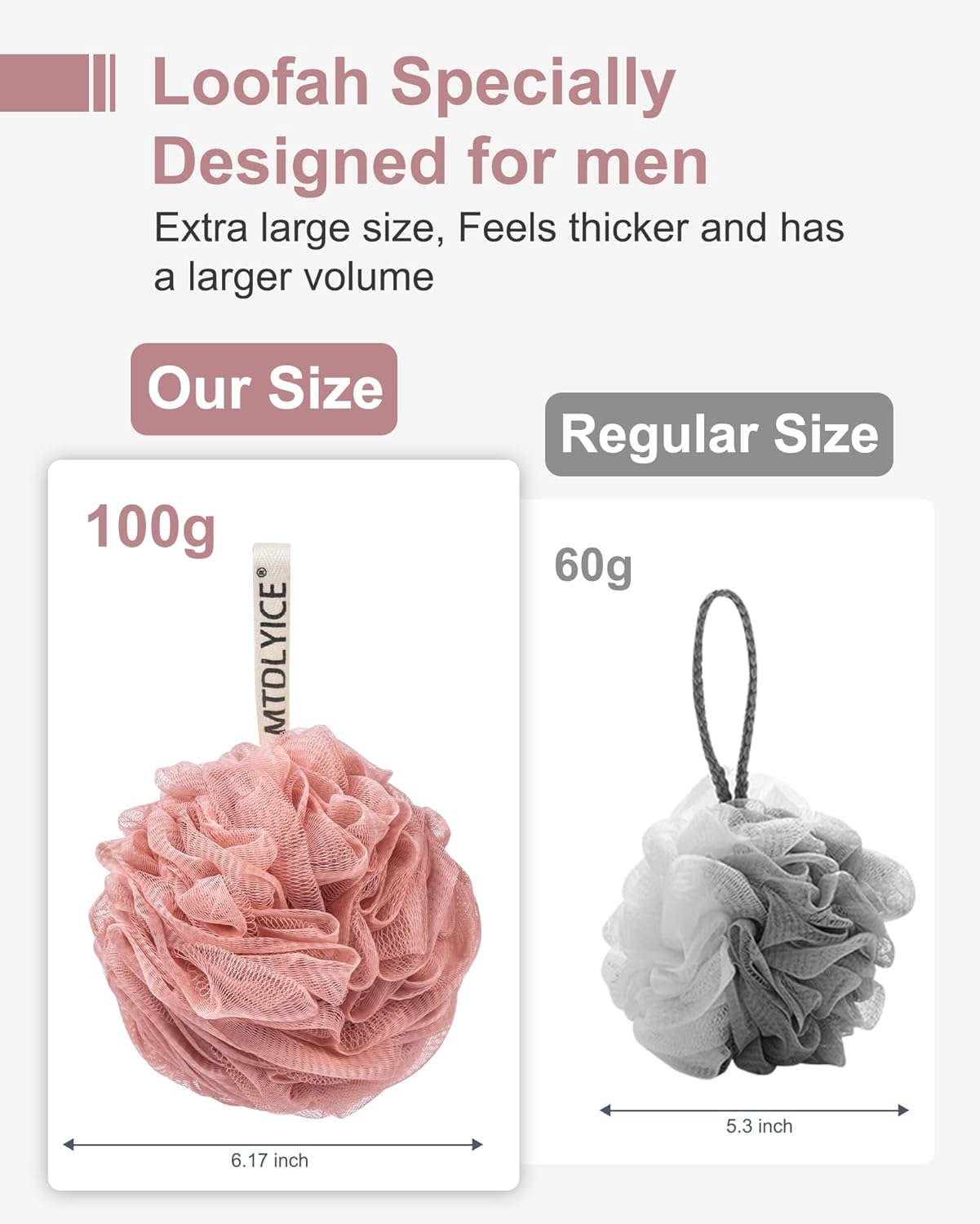- 100g Extra Large Loofah: larger size and density, easier to generate foam, greatly increased contact area with the body, cleaning efficiency significantly increased, relaxing exfoliation, gentle skin