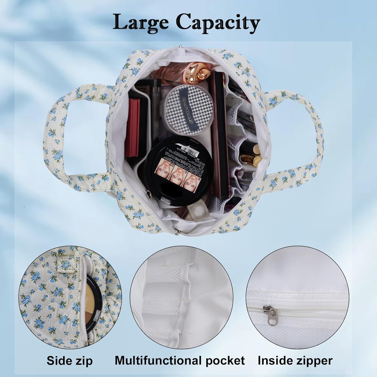 Cute Quilted Floral Makeup Bag(2Pcs),Coquette Aesthetic Cosmetic Bag,Travel Toiletry Bags, Kawaii Aesthetic pouch for Women (13-Blue)