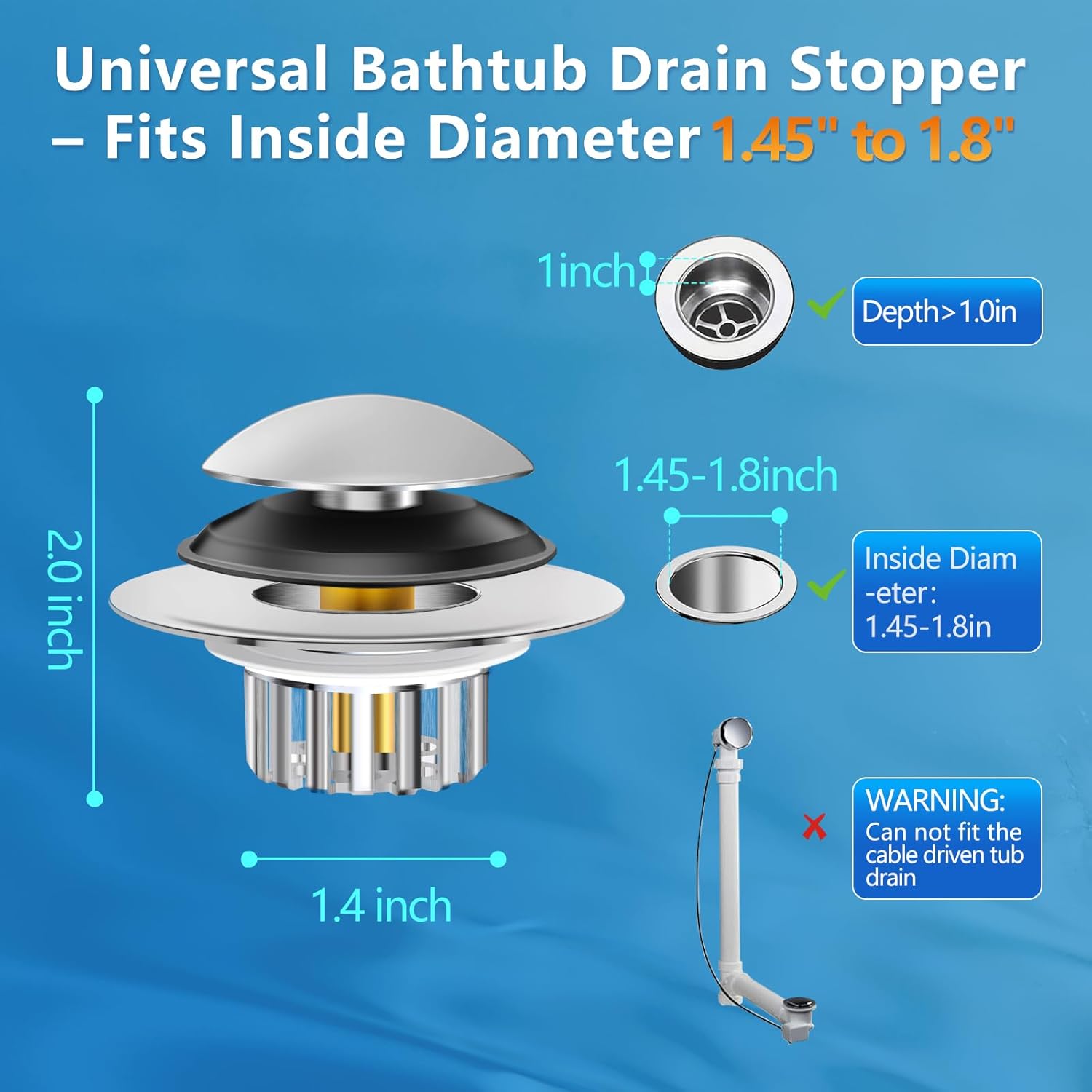 - 【Bathtub Drain Stopper Universal Fit】Fits 1.45"-1.8" (37mm-46mm) drain holes, Replaces Lift and Turn, Tip-Toe and Trip Lever drains for Tub. Just press to install – no screws or tools!