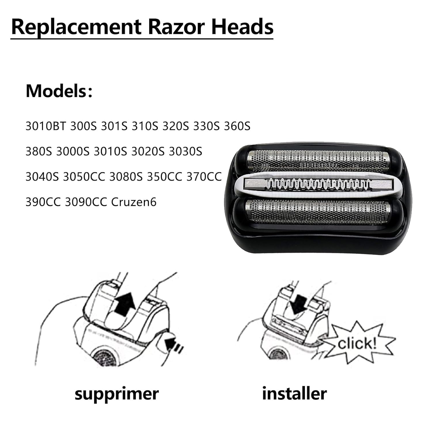 - BROAD COMPATIBILITY -32B Foil & Cutter Replacement heads Compatible with series 3 300S 301S 310S 320S 330S 340S 360S 380S 3000S 3010S 3020S 3030S 3040S 3050S 3080S 3090S 350CC 370CC 390CC 3050CC 3090CC 5772 5773 5774 5776 5779 Cruzer6 and so on.