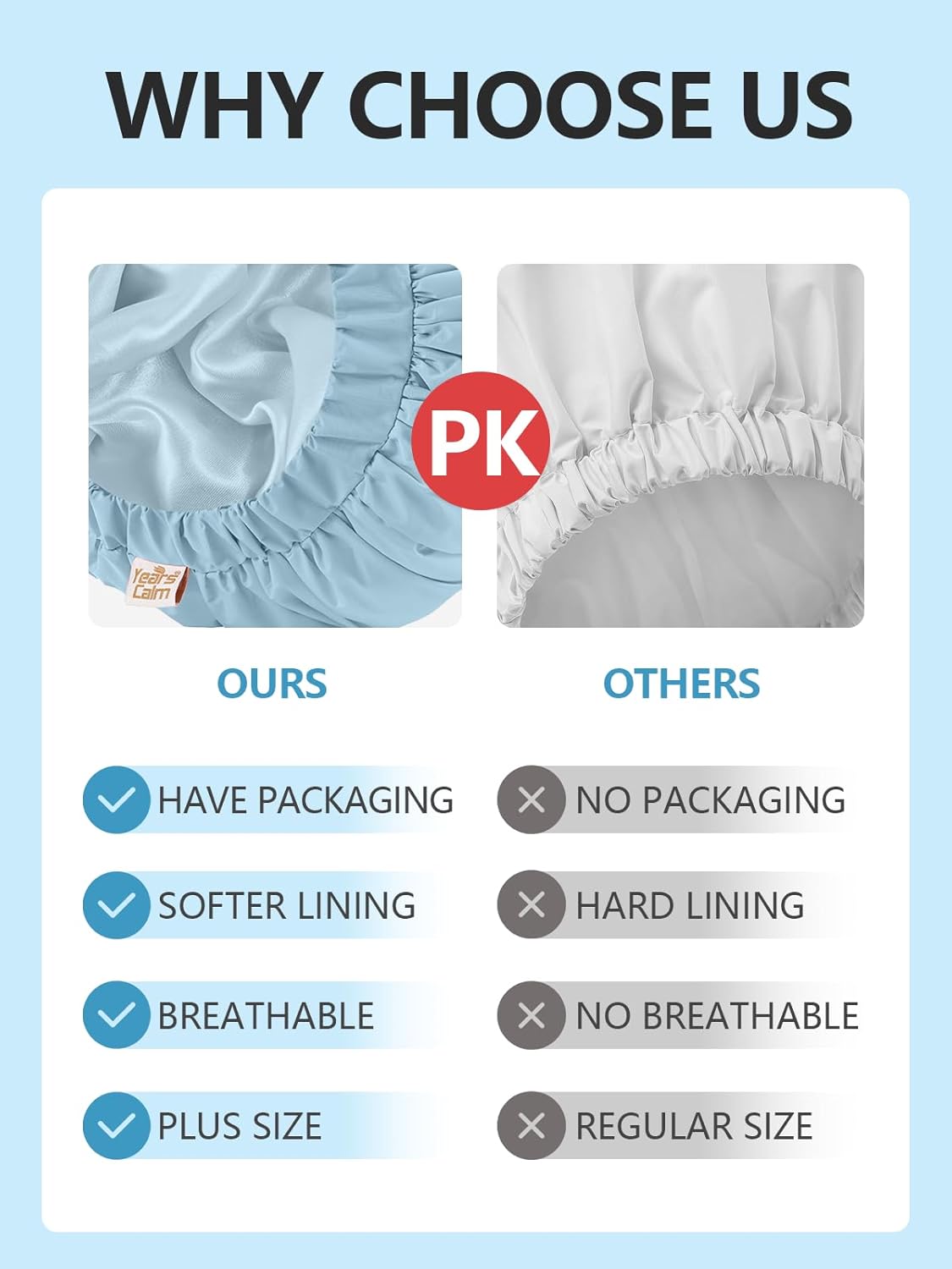 - Waterproof Hair Protection: Made with a dual-layer design, featuring waterproof memory cotton and a soft satin lining, our shower cap prevents water from soaking through and helps protect your hair from damage. Ideal for all hair types, including long hair