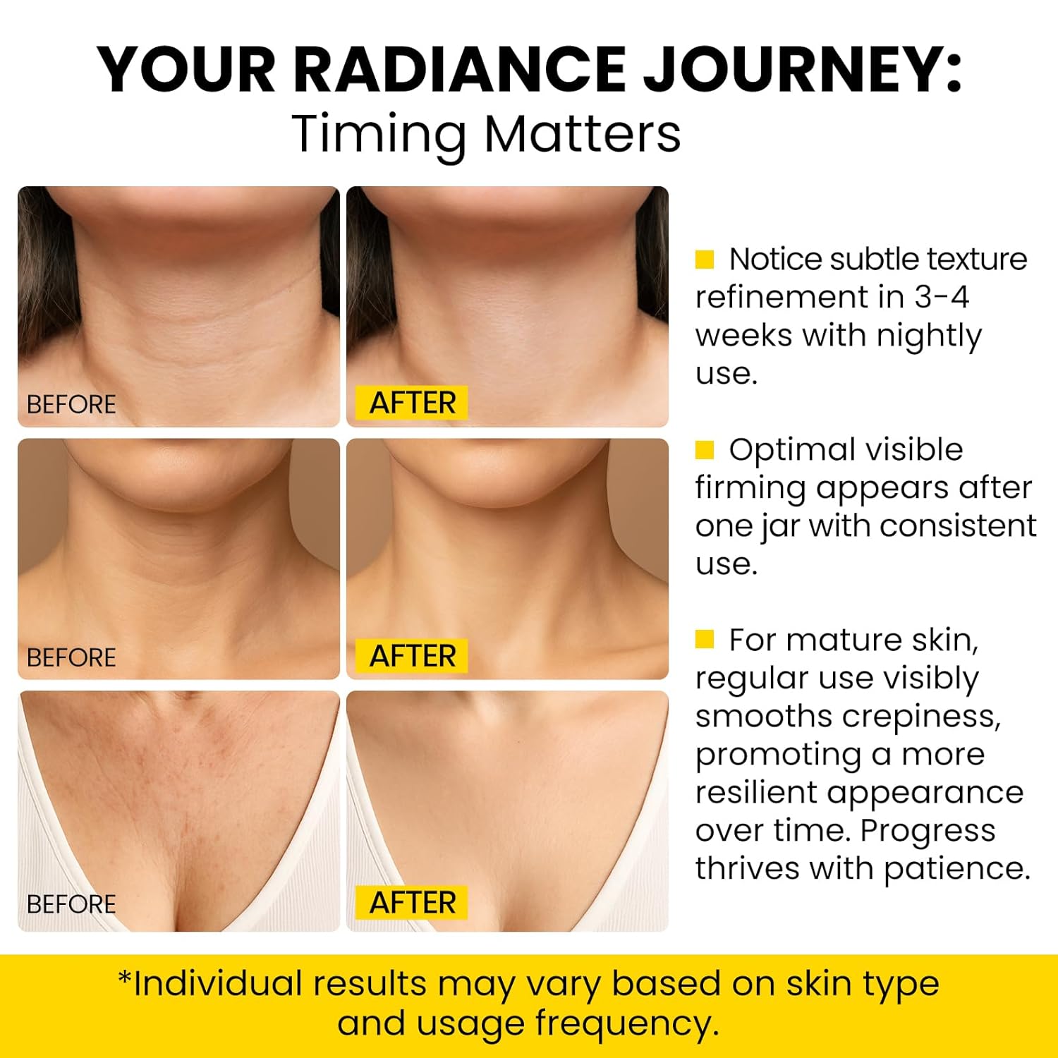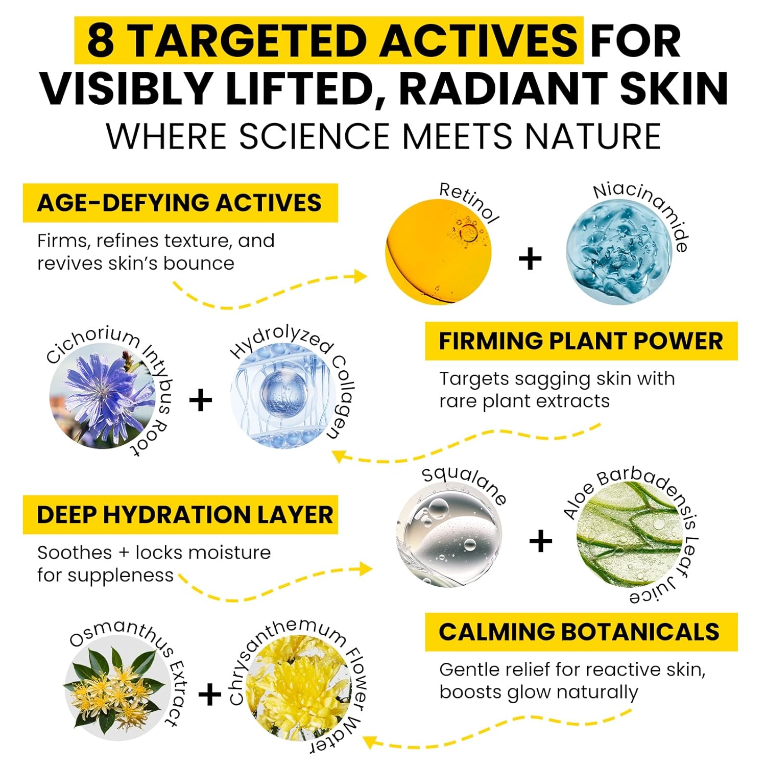 - Youthful Radiance & Tone: Our 8-in-1 formula blend of retinol and niacinamide works synergistically to minimize the appearance of fine lines and wrinkles while promoting a more even-looking skin tone. Dull, blotchy patches are replaced by a youthful glow as this cream diminishes the look of discoloration, revealing a more radiant, revitalized neck and chest.