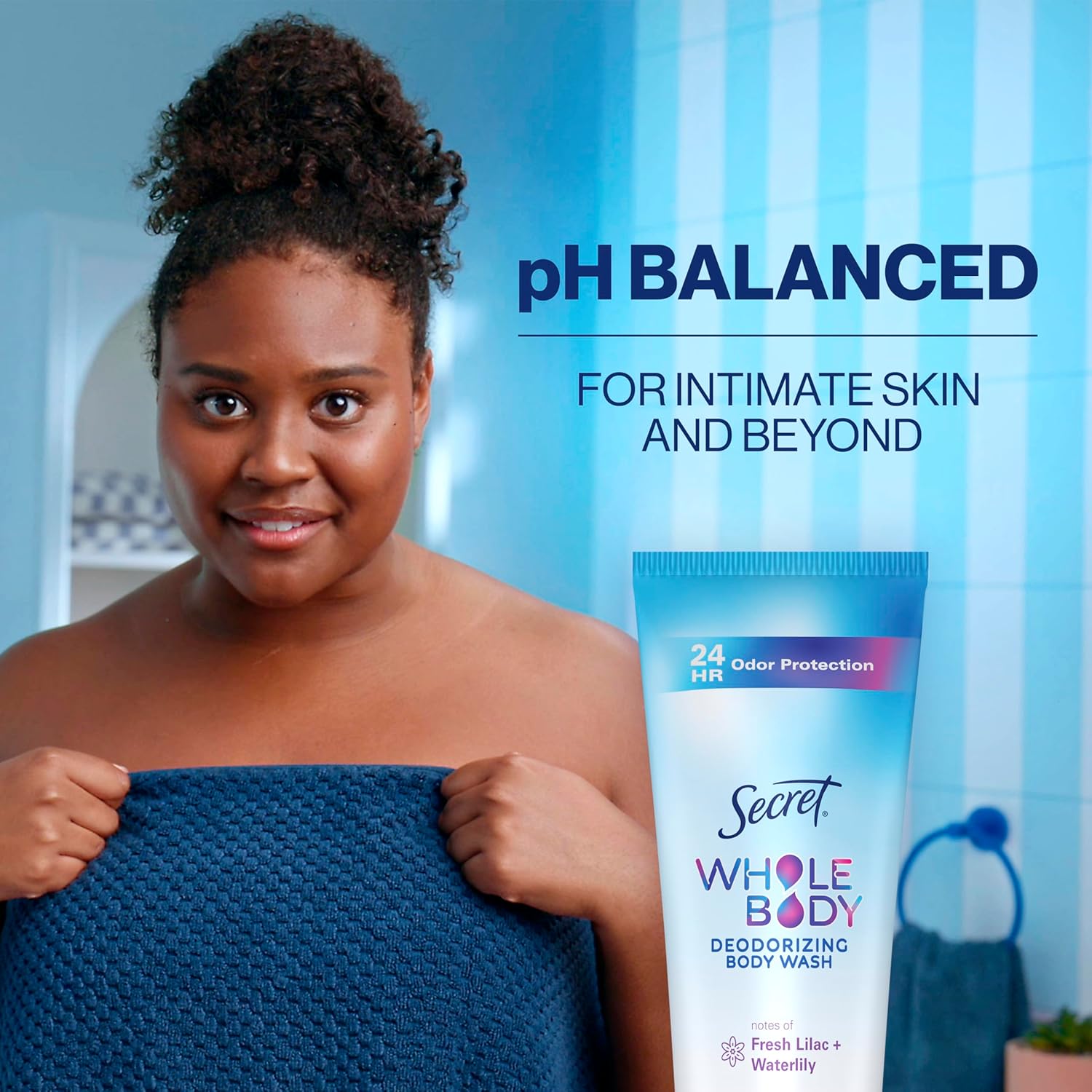 Secret Feminine Wash, 24 HR Deodorizing Feminine Body Wash for Women, Removes 6x Causes of Odor, PH Balanced, Safe to Use Everywhere, Lilac & Waterlily Scent, 8.0 oz