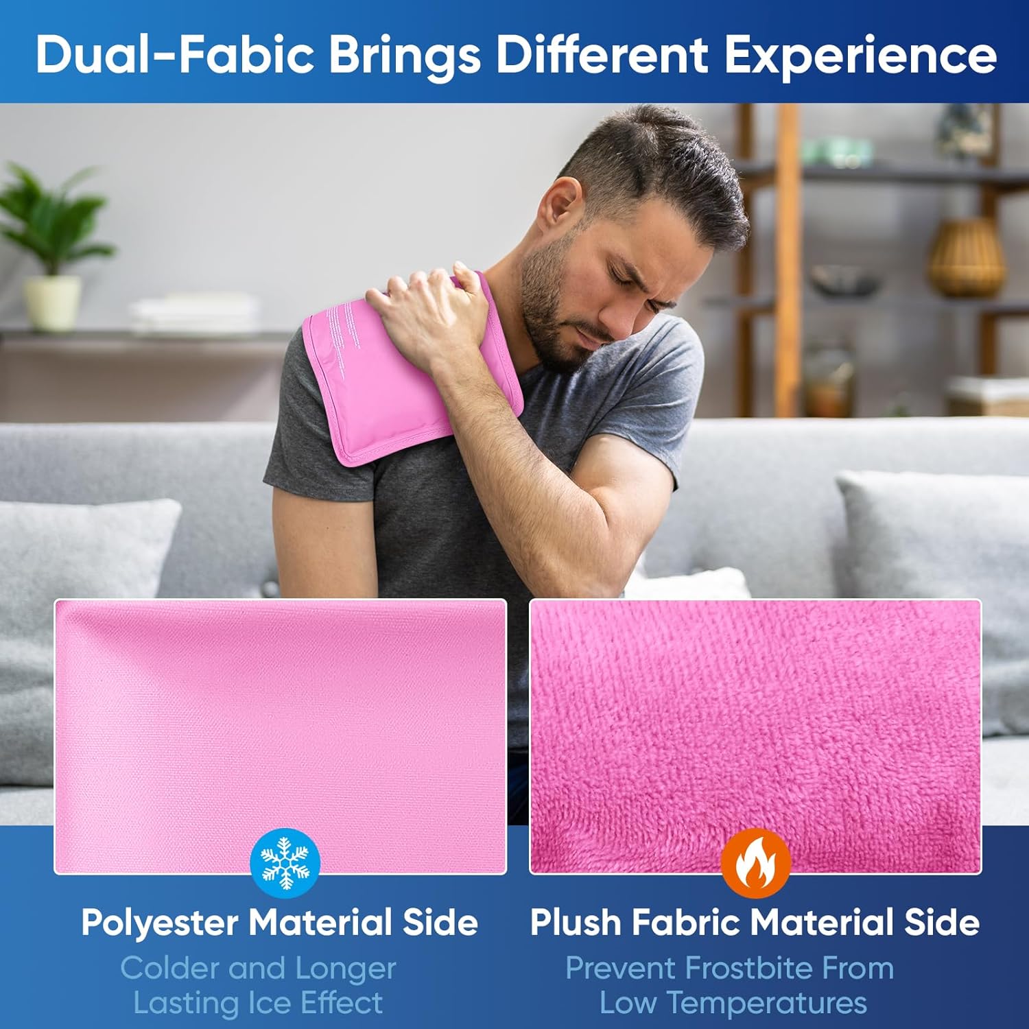 - Double-Sided Material: The gel ice packs reusable feature two-sided materials, one side is made of polyester for a stronger and longer-lasting cooling effect, while the other side is soft plush fabric, which prevents frostbite and enhances comfort during cold therapy