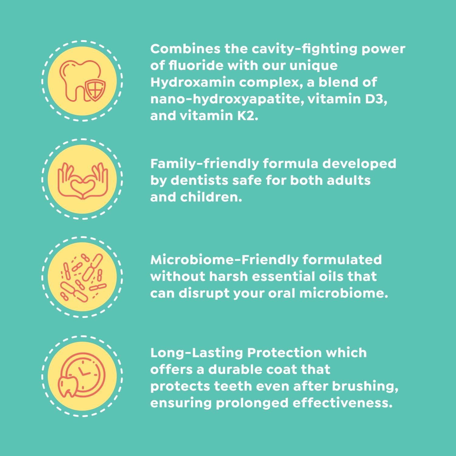 - Dual Power of Fluoride & Liquid Enamel Technology️ for Maximum Protection: Pair the cavity-fighting benefits of fluoride with our patented Liquid Enamel Technology️—a proprietary blend of 10%+ nano-hydroxyapatite, vitamins D3 & K2, and an alkaline pH—to help strengthen enamel, ease sensitivity, support gum health, and protect against cavities. Designed with optimal ingredient concentrations for maximum efficacy, it’s a powerful choice for both adults and kids.