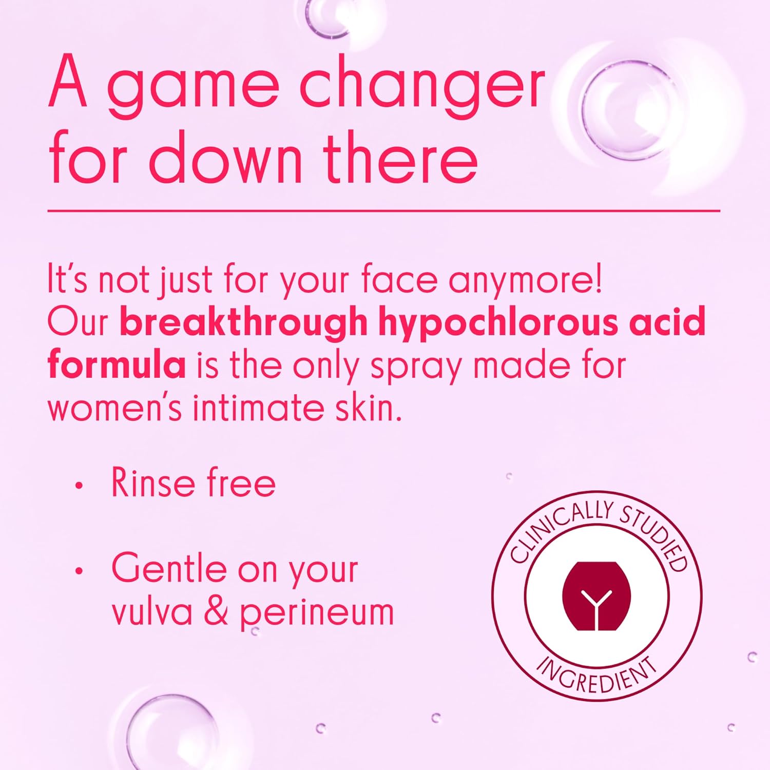 - HYPOCHLOROUS TECHNOLOGY FOR WOMEN'S SKIN CARE: Intimate Skin Support Spray with FDA-cleared hypochlorous acid formula. Helps sweep away buildup that can cause odor, and soothes minor irritations. Gently cleanses intimate skin for daily freshness.