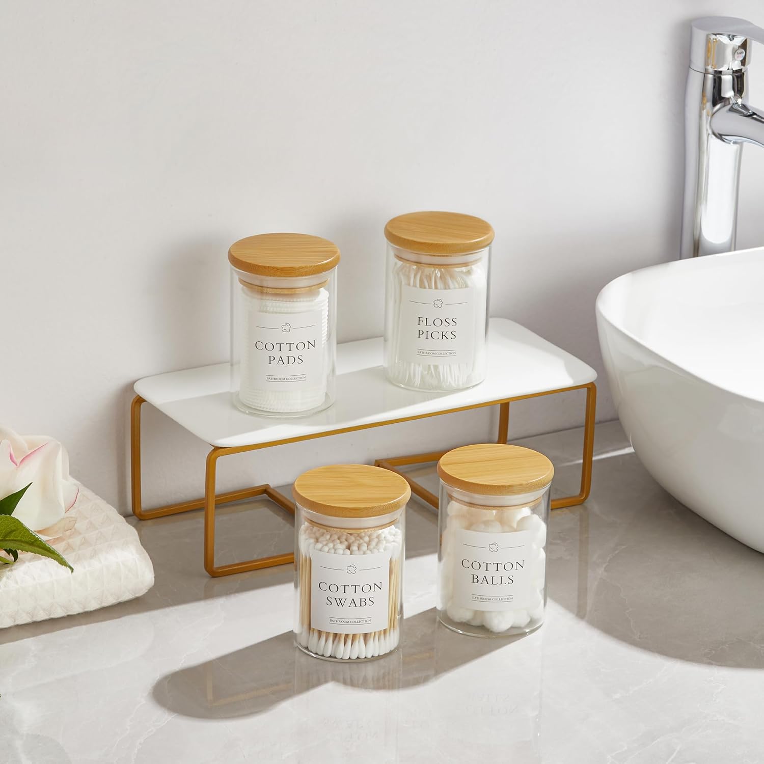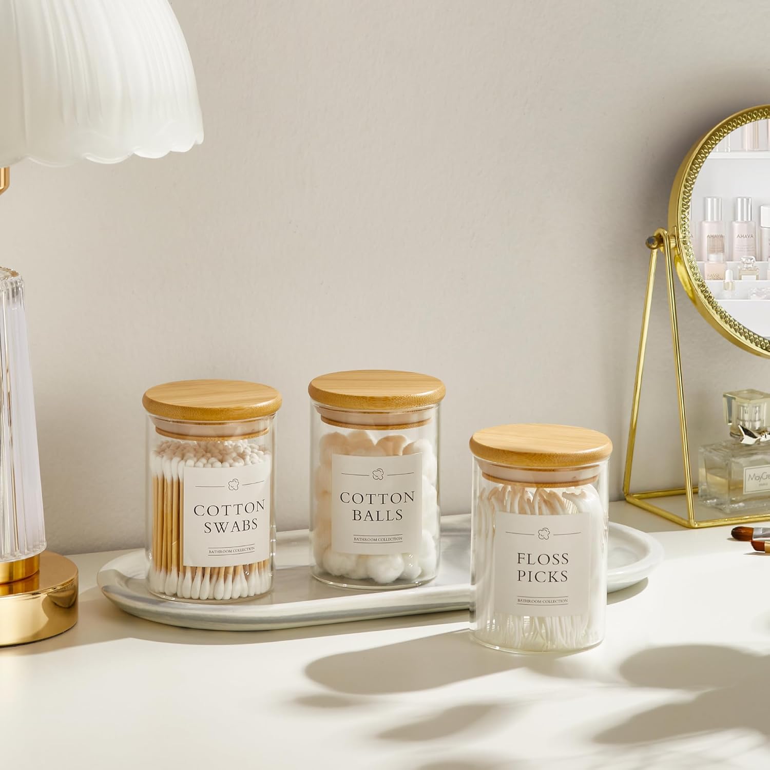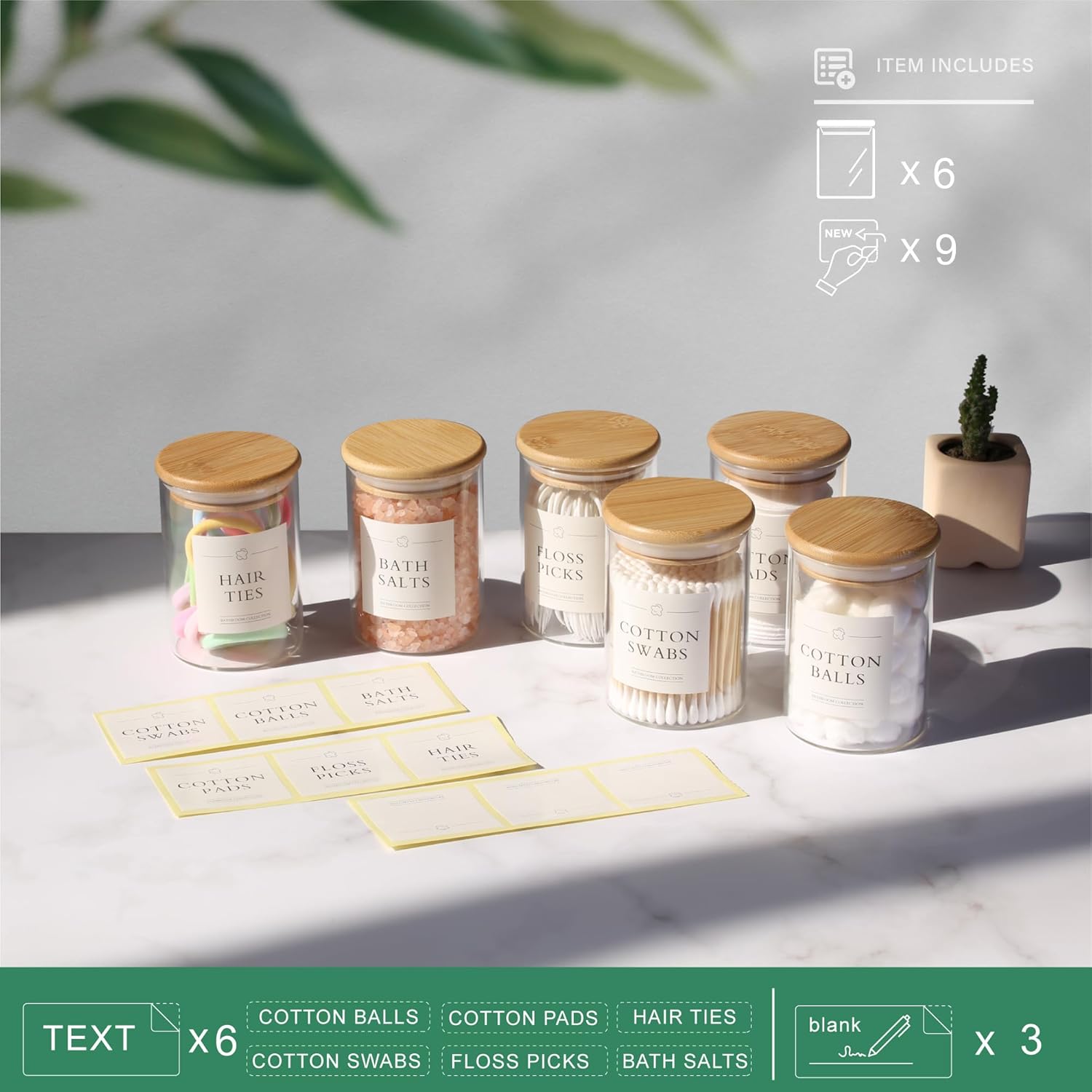 - Qtip Holder Bathroom Set: The q tip holder set includes 6 pack glass bathroom containers jars; 6 labels with black pre-printed words (Cotton Swabs, Cotton Balls, Cotton Pads, Floss Picks, Hair Ties, Bath Salts); and 3 blank labels.