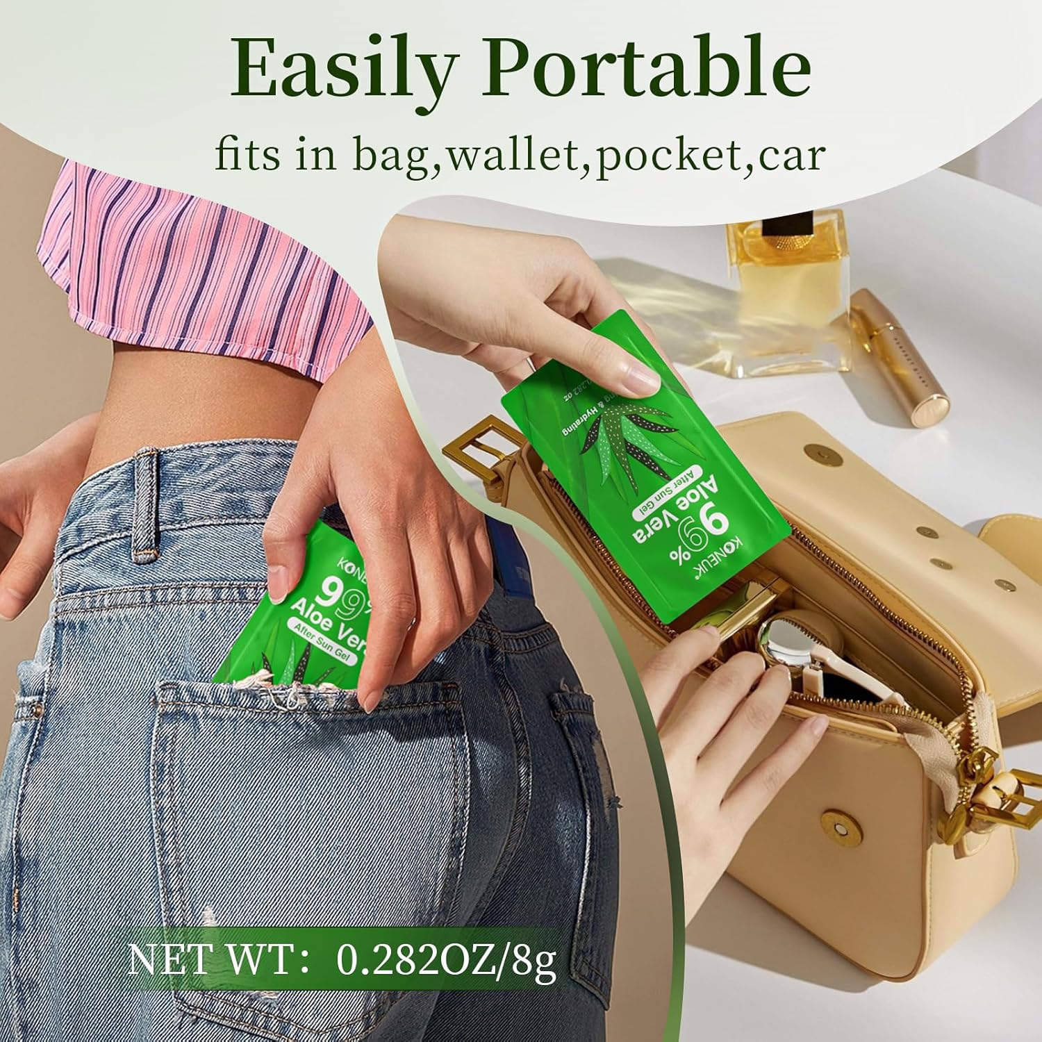 - 【99% Pure Aloe Vera Gel】This set of aloe vera gel has 30 packs,each pack is 0.282oz,each pack of aloe vera gel is individually packaged,they are very suitable for carrying around,when you use these aloe vera gel,you will feel very soothing and cool,it absorbs quickly without any sticky residue,leaving your skin smooth and hydrated