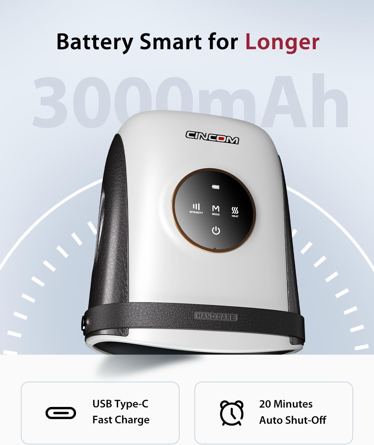 - CINCOM Hand Massager : Multiple Massage Modes to enjoy a variety of customizable settings, including kneading, air compression, and soothing heat to relieve stress and discomfort in the palms, fingers, and knuckles
