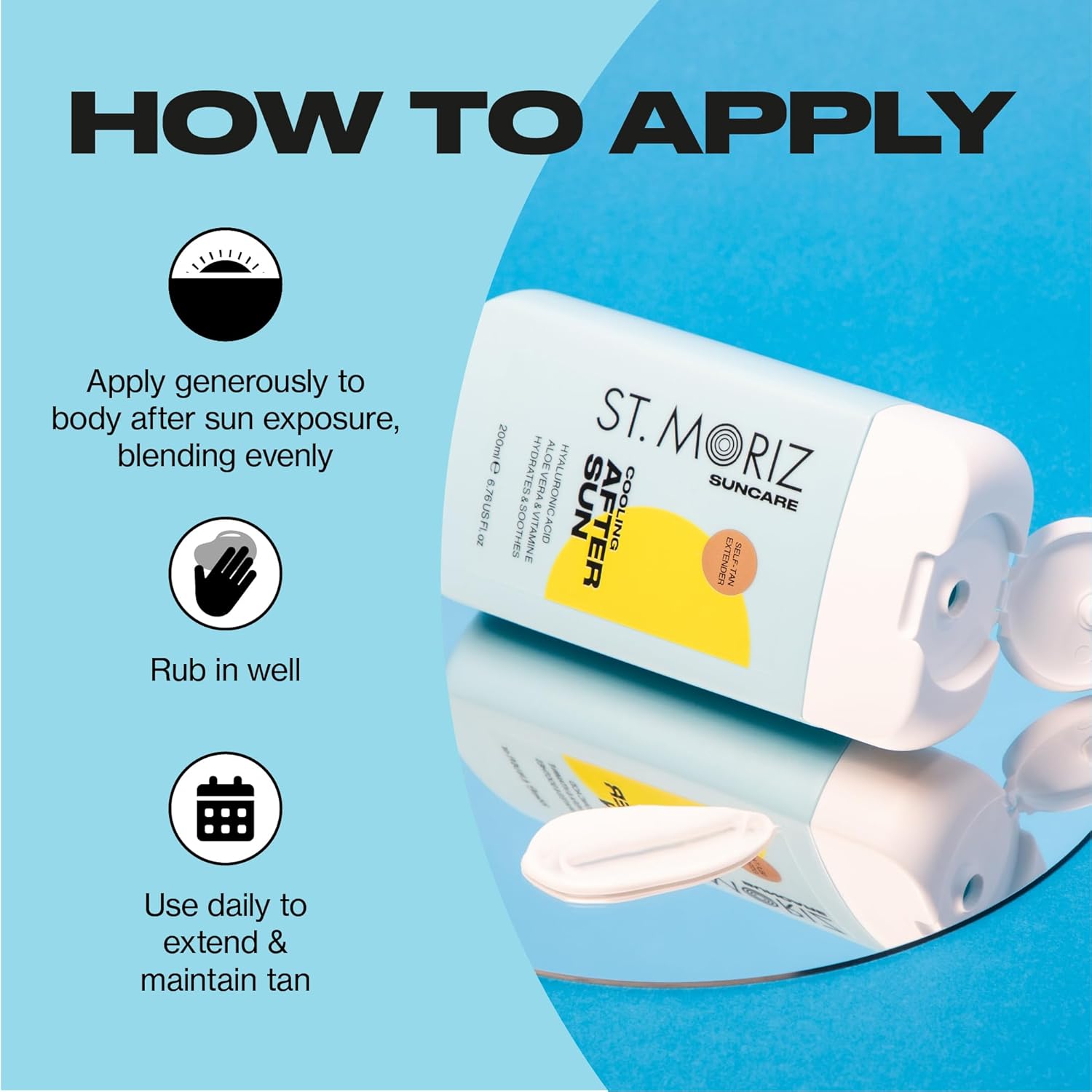 • INTENSELY HYDRATES & COOLS SKIN AFTER SUN: The St. Moriz Suncare Cooling After Sun lotion is fast absorbing & deeply nourishes the skin after sun exposure. Infused with Hyaluronic Acid, Aloe Vera & barrier strengthening Vitamin E to soothe & moisturise.