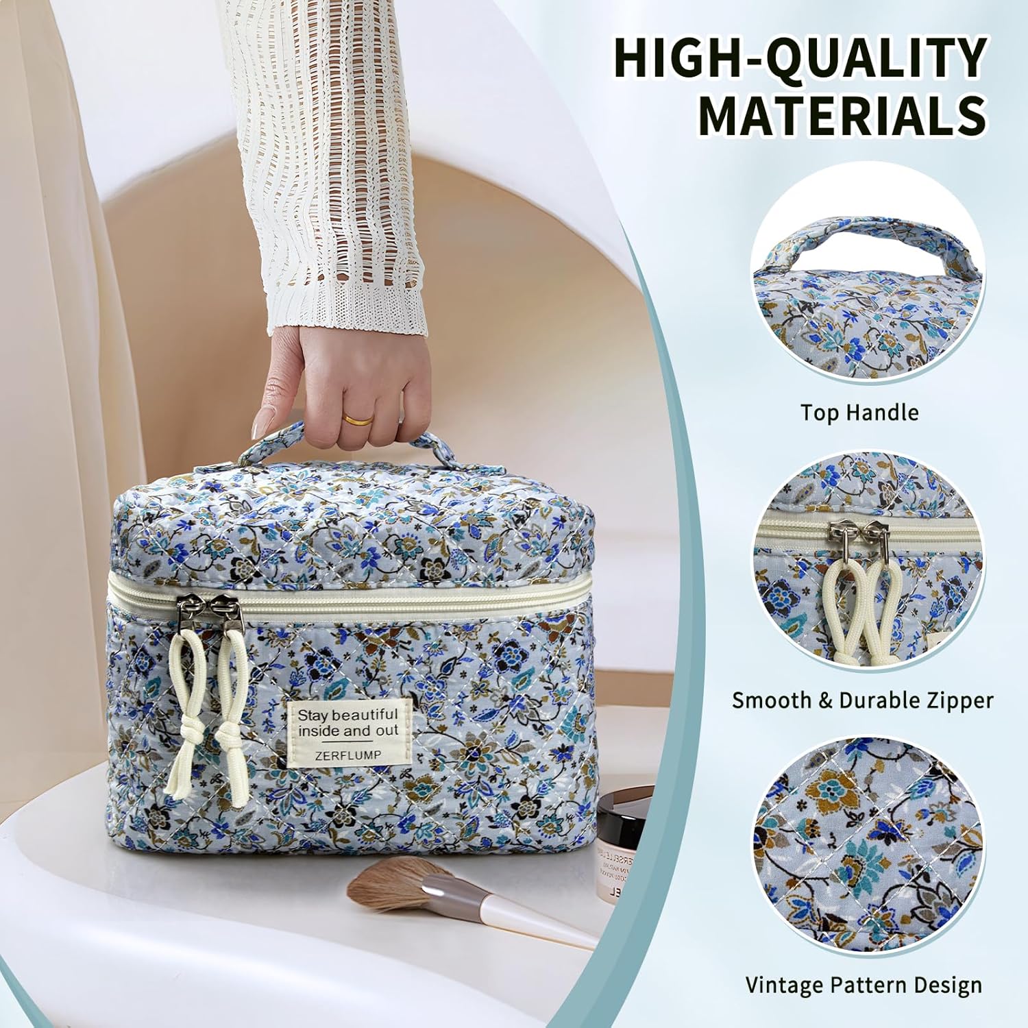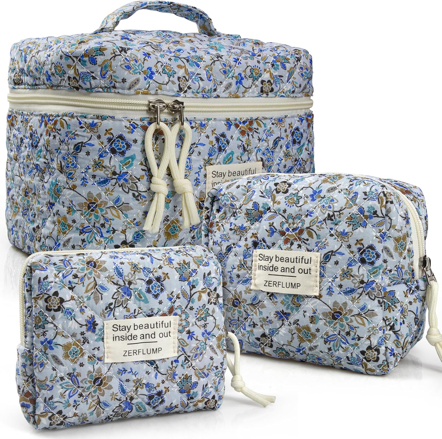 Cute Quilted Floral Makeup Bag(3Pcs),Coquette Aesthetic Cosmetic Bag,Travel Toiletry Bags, Kawaii Aesthetic pouch for Women (62-BlueVine)