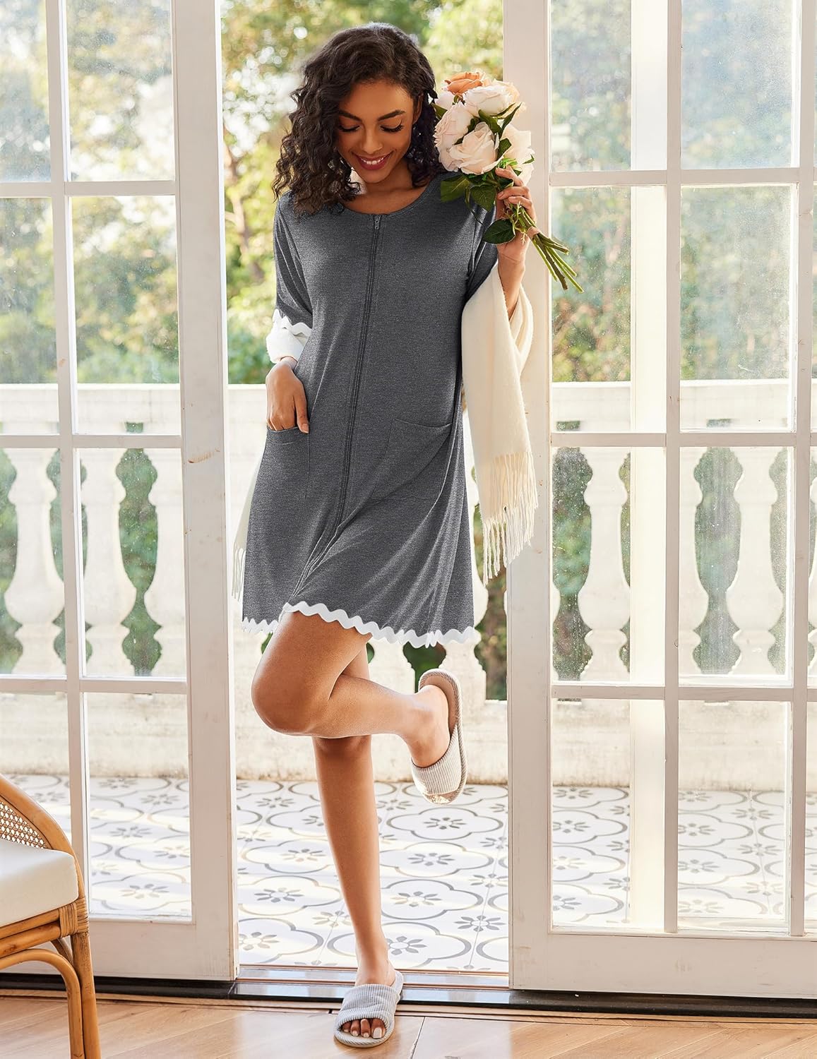 Ekouaer Women Zip Up Robe Lightweight Housecoats with Pockets Knee Length Short Bathrobes Soft Nightgown S-3XL