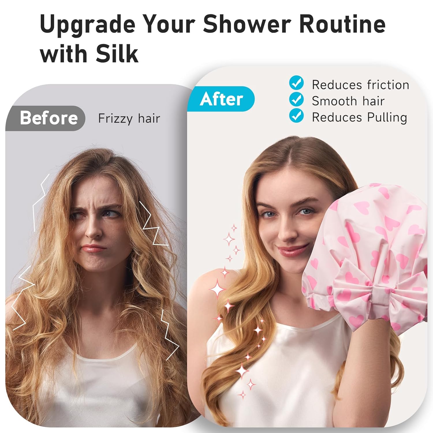 LitBear Luxury Silk Lined Shower Caps for Women Reusable Waterproof, Double Layered Large Bathing Hair Cap with Adjustable Elastic Strap, Non-slip, Quick-dry, for Long Short Hair, Pink Heart