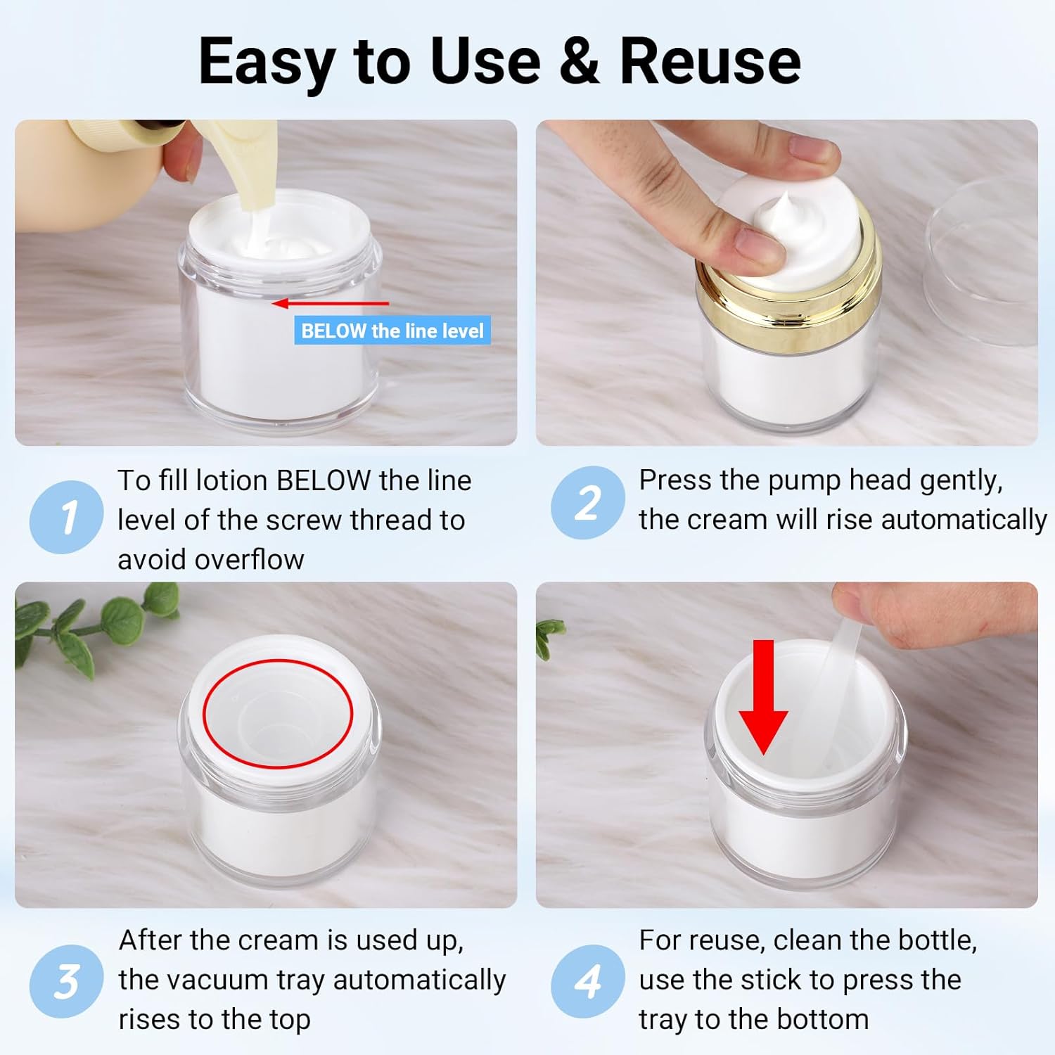 - Innovative Airless Pump Mechanism: Leveraging advanced vacuum technology, our airless pump bottles can protect cosmetics against exposure to air, prolonging the product's freshness. To fill lotion BELOW the line level of the screw thread to avoid overflow