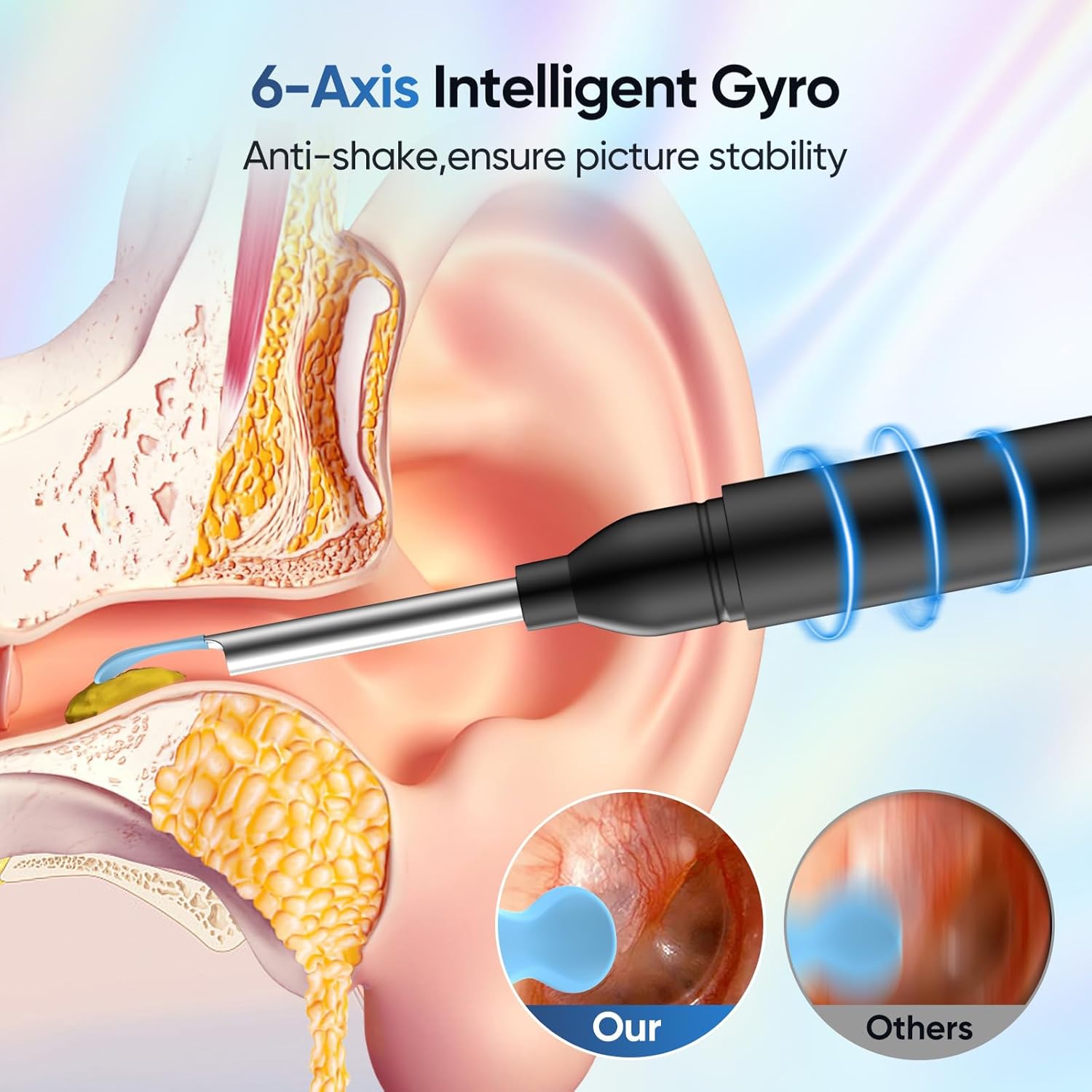 - 1080P HD Ear Camera: The ear wax removal kit features a 1080P high-resolution camera and 6 LED lights that illuminate the dark environment of the ear canal, allowing for clearer real-time visualization of intricate details. Additionally, the three-axis gyroscope enables smooth exploration and reversible left-right movement for precise inspection