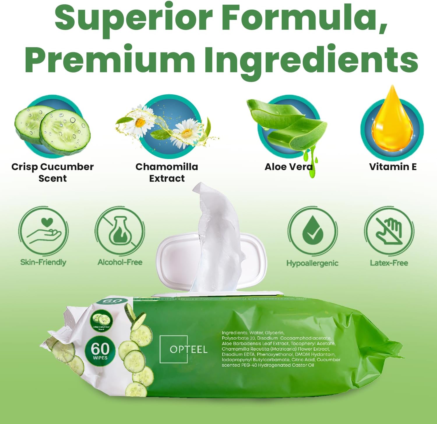 - SCENTED WITH A REFRESHING CUCUMBER TOUCH β These adult wipes offer a light, soothing cucumber scent for a fresh, clean feel. Infused with aloe vera and vitamin E, they gently cleanse and nourish sensitive skin, making them perfect for incontinence care, elderly hygiene, and daily refreshment.