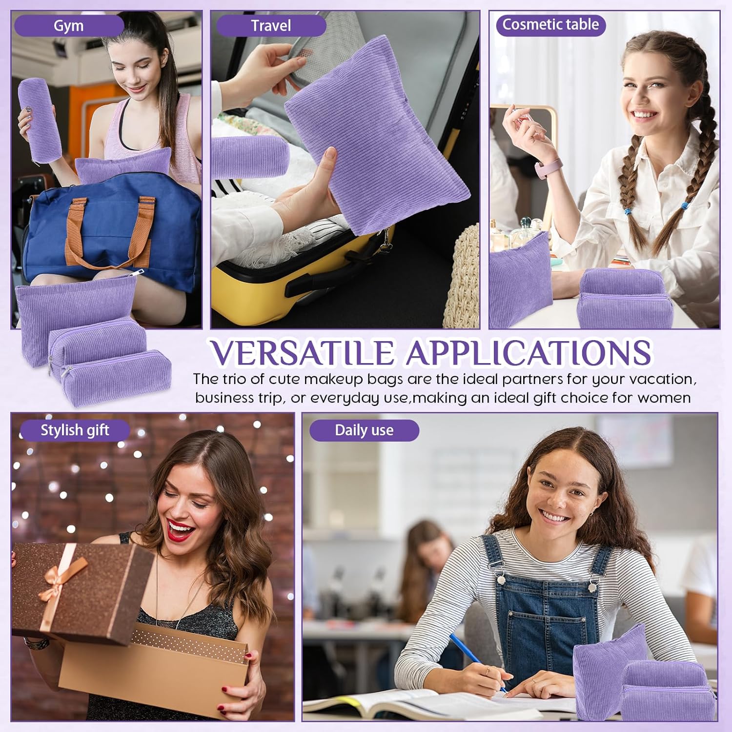 - Material and Attractive Design: the makeup and toiletry travel bag set is mainly crafted from quality corduroy material, ensuring high durability and prolonged service life; The bags feature solid purple color design in different sizes; This makes them compatible with various styles of outfits