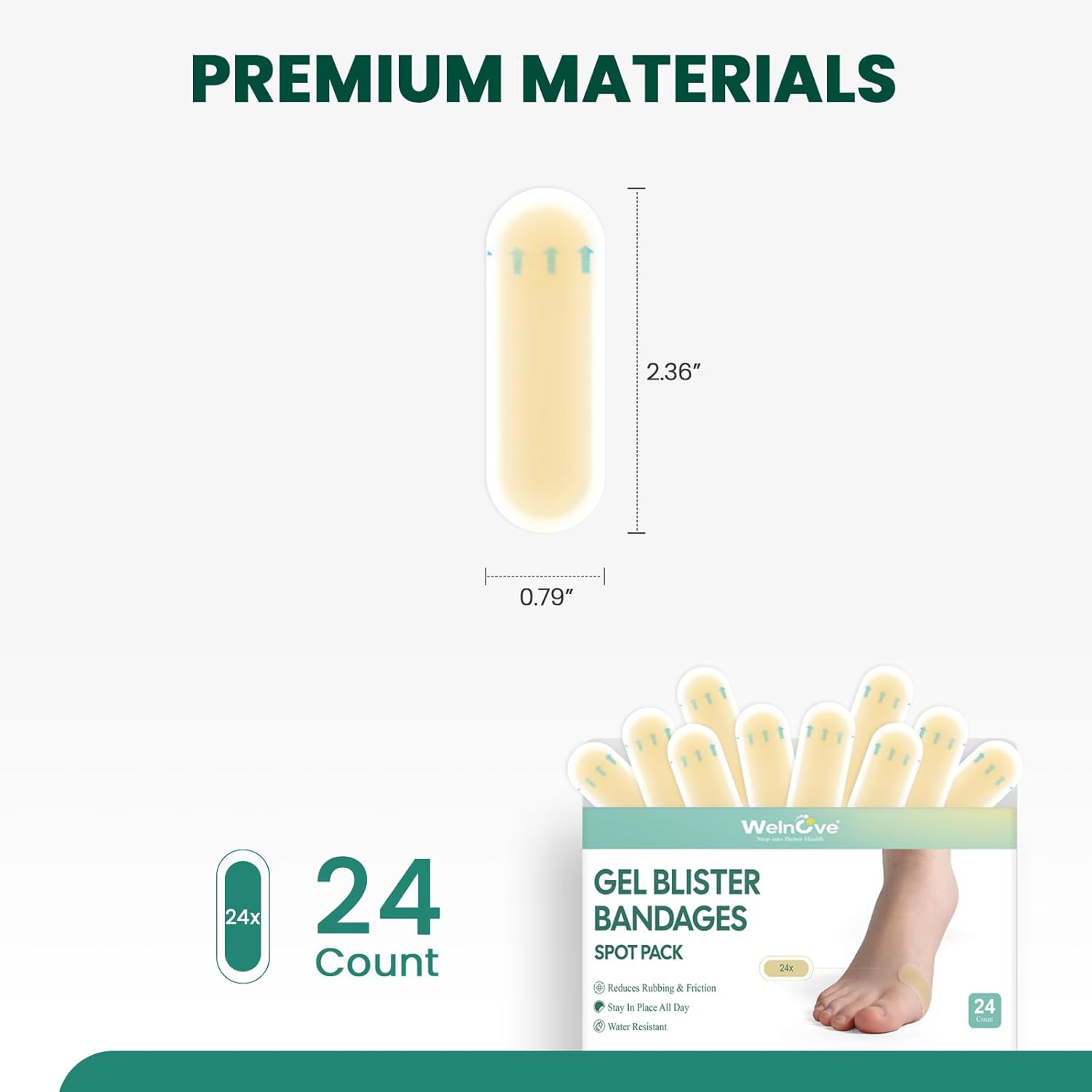 Welnove Gel Blister Bandage - 24 PCS Hydrocolloid Bandages for Prevention & Recovery, Blister Cushions for Heel, Toes & Foot, Blister Bandages for High Heels, Sandals, Wedding, Party (Spot Pack)