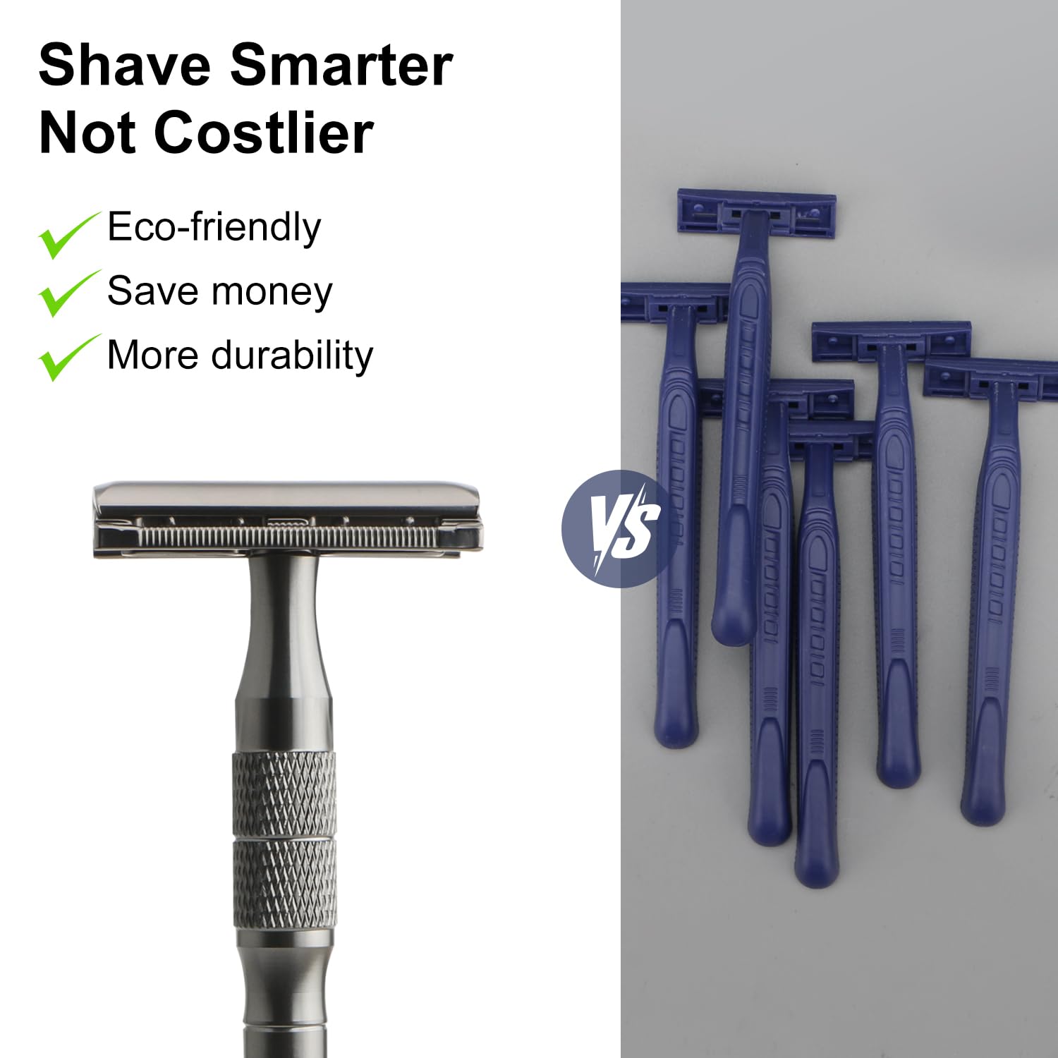 - Environmentally Conscious: In an era where eco-friendliness matters, our eco razor stands out. Unlike disposable plastic razors, this metal safety razor only requires you to replace the double edged razor blades, making it a great choice for eco-friendly shaving