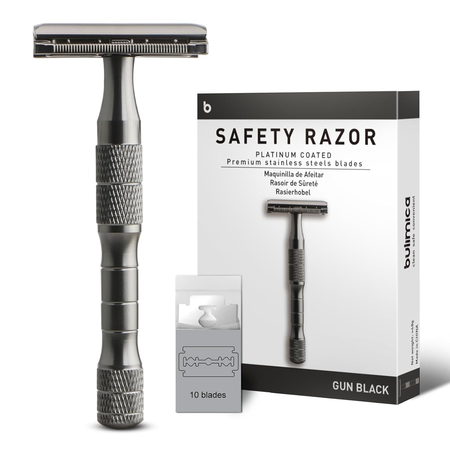Gun Black Safety Razor, Single Blade Razors for Men, with 10 Platinum Coated Stainless Steel Double Edge Safety Razor Blades, Smooth & Close Shave, Plastic Free, Sustainable