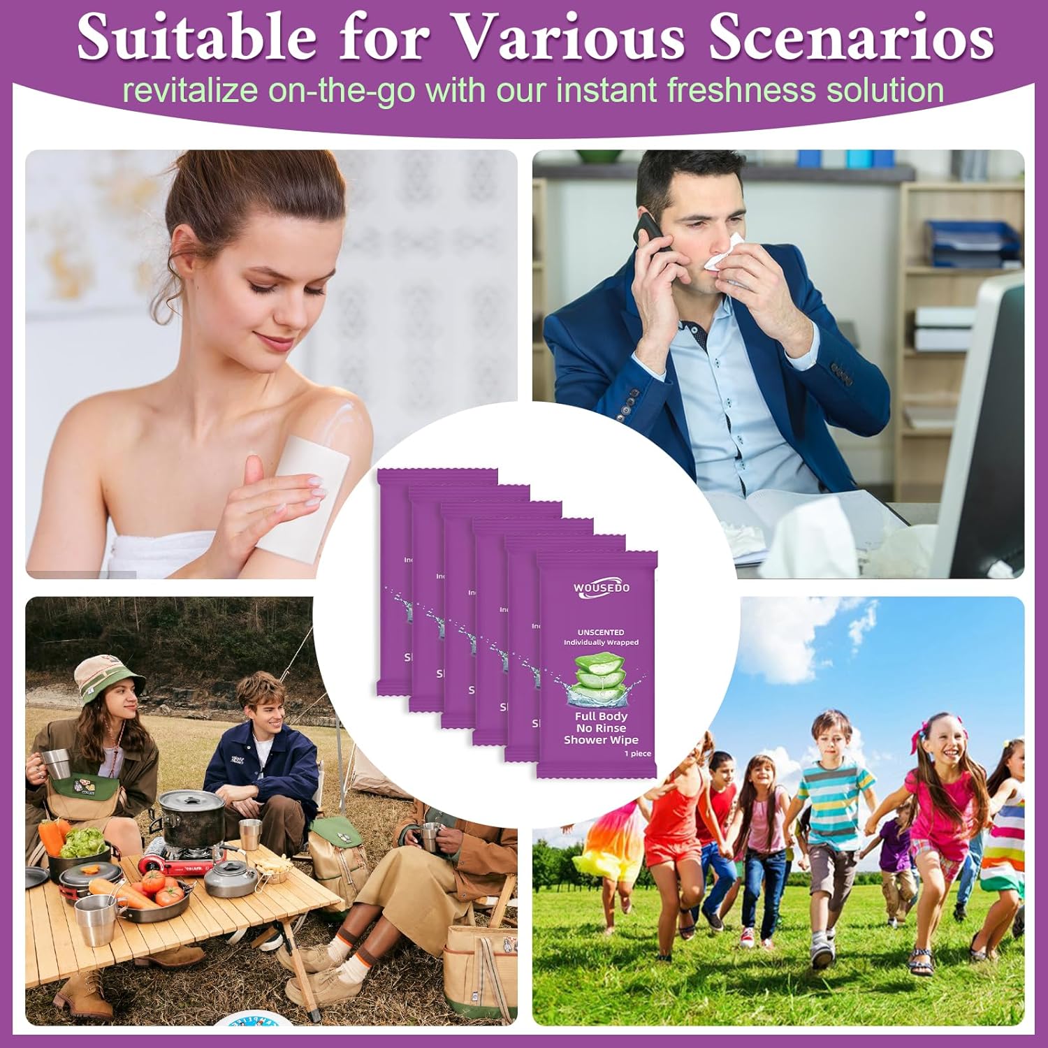 - Wide Applications: Our body wipes are suitable for all age groups and can be applied in a variety of scenarios. Whether you are traveling, camping, exercising, or just need a quick refreshment during the day, our shower wipes are always handy. They are a convenient and efficient cleaning solution that fits your active lifestyle, suitable for home, office, gym and other outdoor settings.