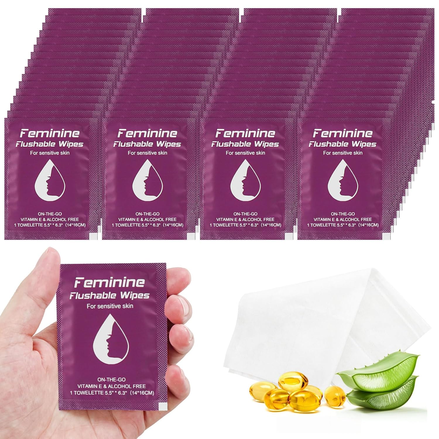 Feminine Wipes Individually Wrapped, Flushable Wipes Travel,Travel Wipes for Women,Feminine Care Wet Wipes Travel Size Vaginal Wipes for Adult, Girl and Homeless (unscent,50)
