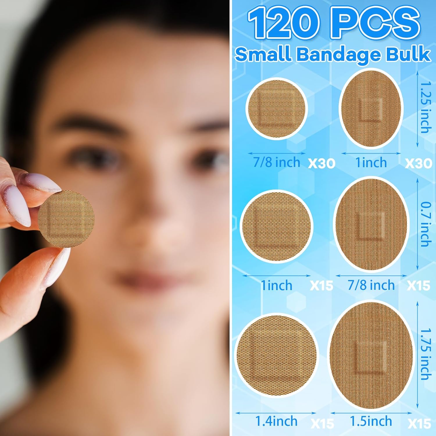 - Small round fabric bandage size: Finger bandages have 6 sizes, 3 round ones, namely 7/8 Inch, 30 pcs, 1 inch 15 pcs, 1.4 inch 15 pcs, 3 oval sizes, namely 1 x 1.25 inch 30 pcs, 7/8 x 0.7 inch 15 pcs, 1.5 x 1.75 inch 15 pcs; You can choose the right size to fit your nose, hands, toes and other small parts