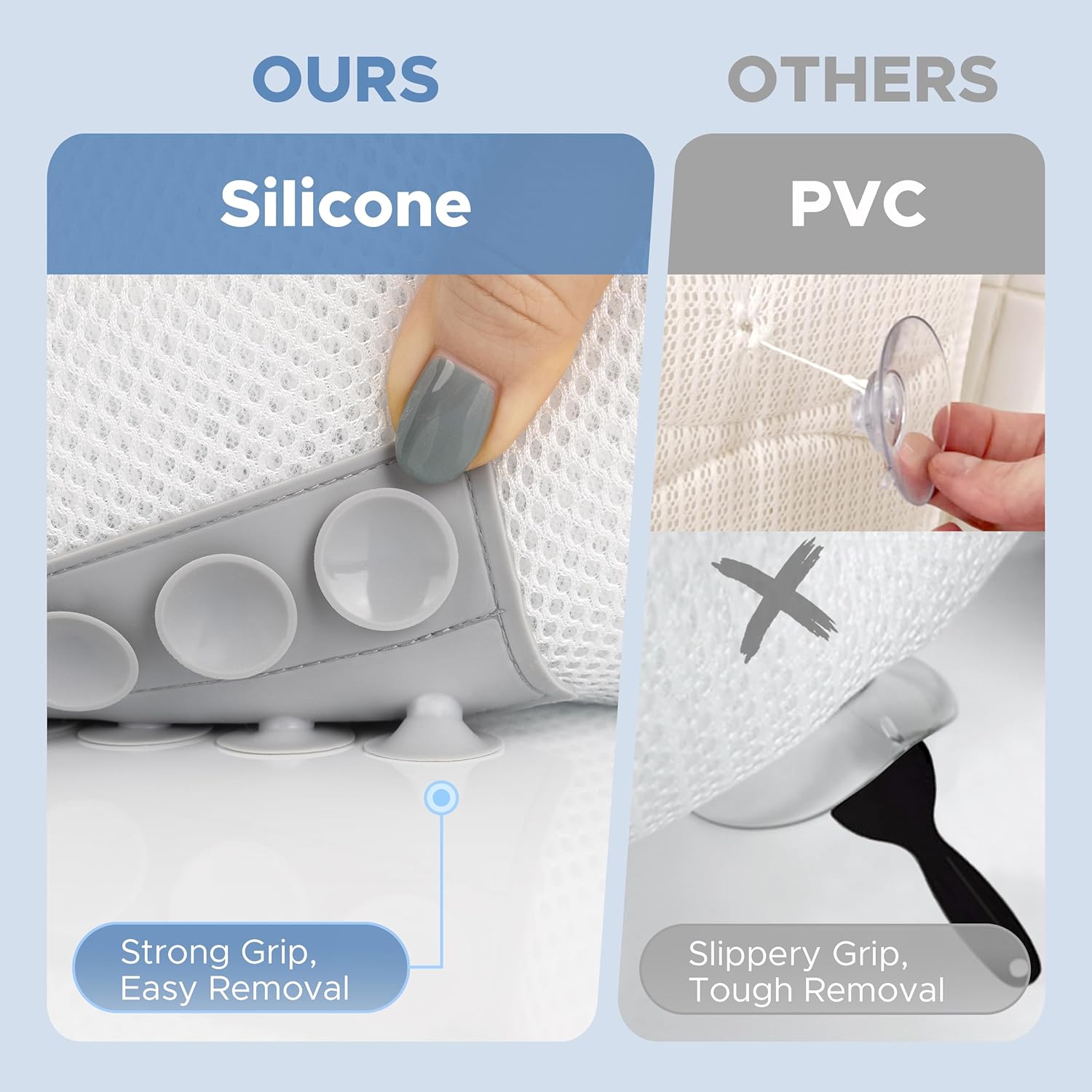 - Details Make the Difference: This luxury bath pillow for tub is crafted from premium silky swimsuit material for an exceptionally gentle touch. Upgraded, powerful suction cups keep it securely in place on most tubs, ensuring uninterrupted relaxation