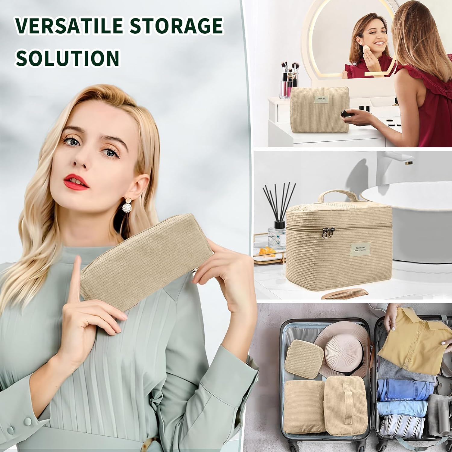 - Our corduroy makeup bags serve both as makeup organizers and storage pouches. They effortlessly hold daily makeup items, skincare samples, and even your phone. The smaller makeup bag can also be used as a stylish wallet. Lightweight and compact, these makeup bags are travel-friendly and easily fit into your suitcase.