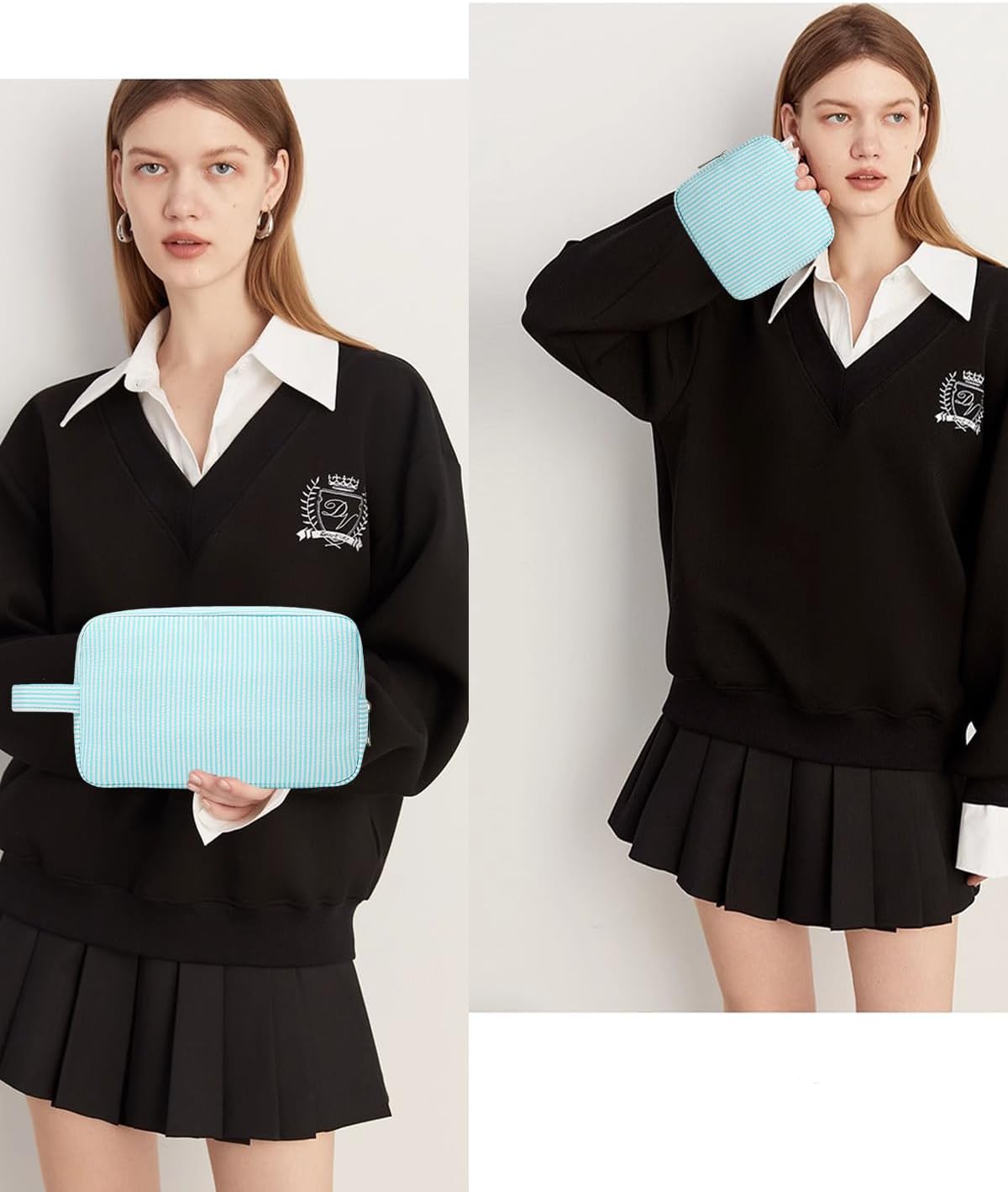 - Multi-functional Use: Toiletry bag with compartments is easy to store makeup brush, make-up, toiletries, eyebrows, eyeliner, cream, lipstick, perfume, jewelry, Air Pods, charging cords, medications, sanitary napkin and other things organized and protected. Can be used as a makeup bag, toiletry bag, or small storage bag ect