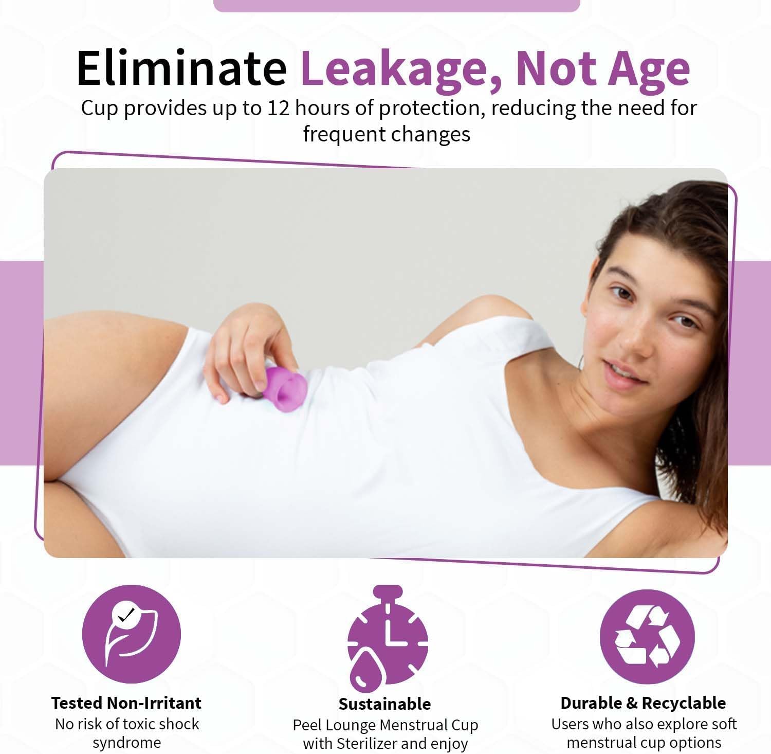 Angel's Peel Lounge Menstrual Cup for Women - 100% Medical-Grade Leak-Free Soft & Flexible Silicone Cup - 12 Hour Leak Protection Eco-Friendly & Reusable Period Cups for Women - Purple - Large