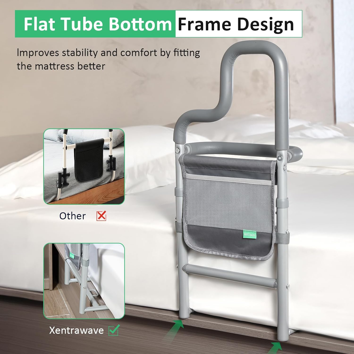 - Very Study & Heavy duty Bed Rail: The bed safety rail is built with a premium steel frame and three horizontal stabilizing bars for maximum stability, supporting up to 300 lbs. Unlike other bed assist bars with circular tube bases, ours features a flat tube base for comfortable and safe use.