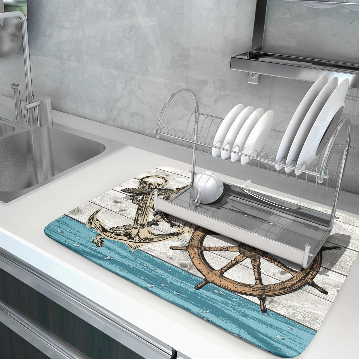Nautical Anchor Dish Drying Mat 18x24 inch Coastal Boat Fast Dry Microfiber Reversible Dish Drainer Pad Kitchen Countertop Tabletop Decor