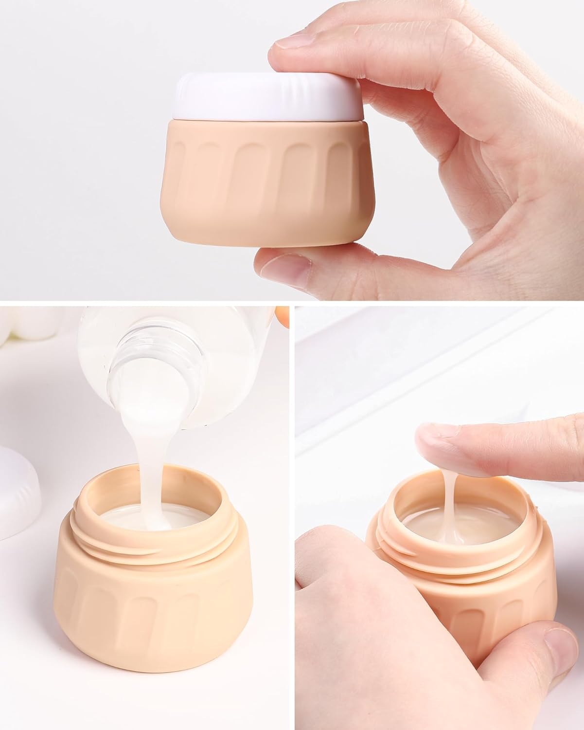 - Travel Size Toiletries: Set includes 4 silicone squeeze bottles 3oz(90ml) and 4 silicone cream jars 1oz(30ml) and clear make-up bag 6.46x2.87x5.31inch. Contents identification label sticker included