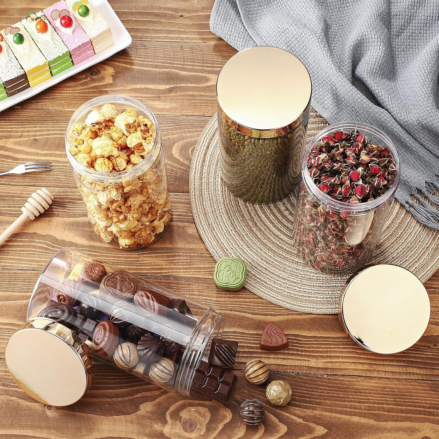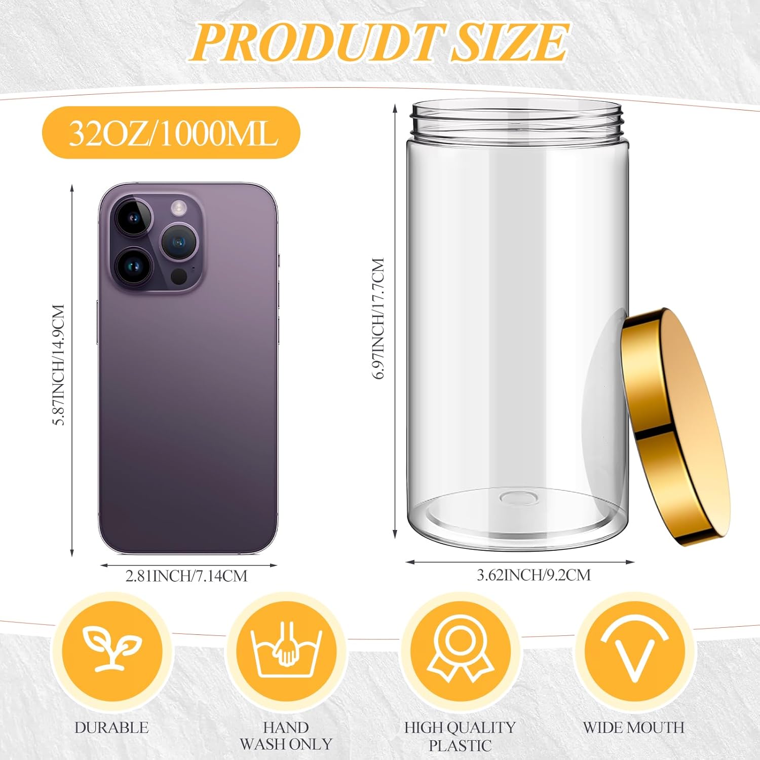 - What You Receive: there are 4 pieces plastic jars with gold screw-on lids; They are durable and refillable, measuring about 32 oz in capacity