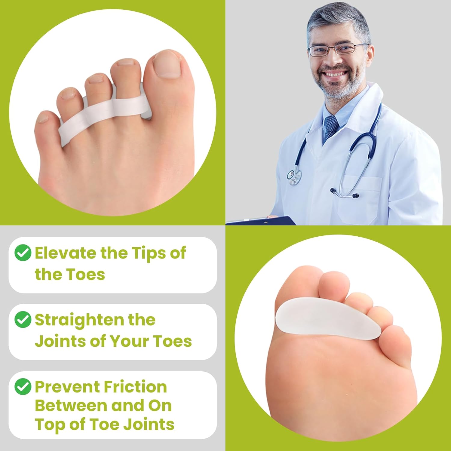 - Physician-Designed Durability - Our toe corrector are made of soft and flexible silicone gel to ensure long-lasting comfort, and our gel can be easily cleaned and reused as often as you need. Silicone and latex free for sensitive skin.