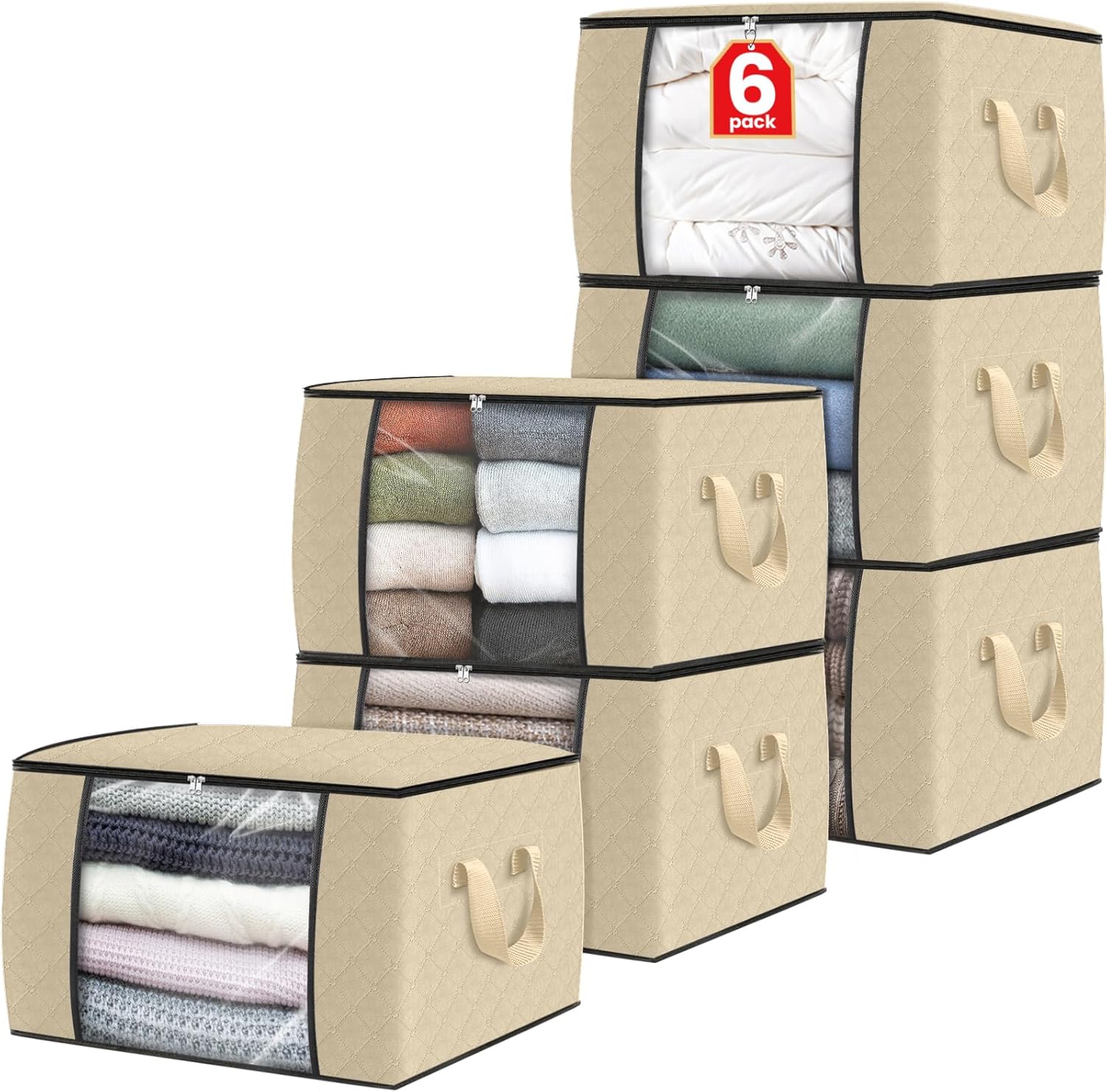 Fab totes 6 Pack Clothes Storage, Foldable Thick Fabric Blanket Storage Bags, Containers for Organizing Bedroom, Closet, Clothing, Comforter, Organization with Handle,Beige