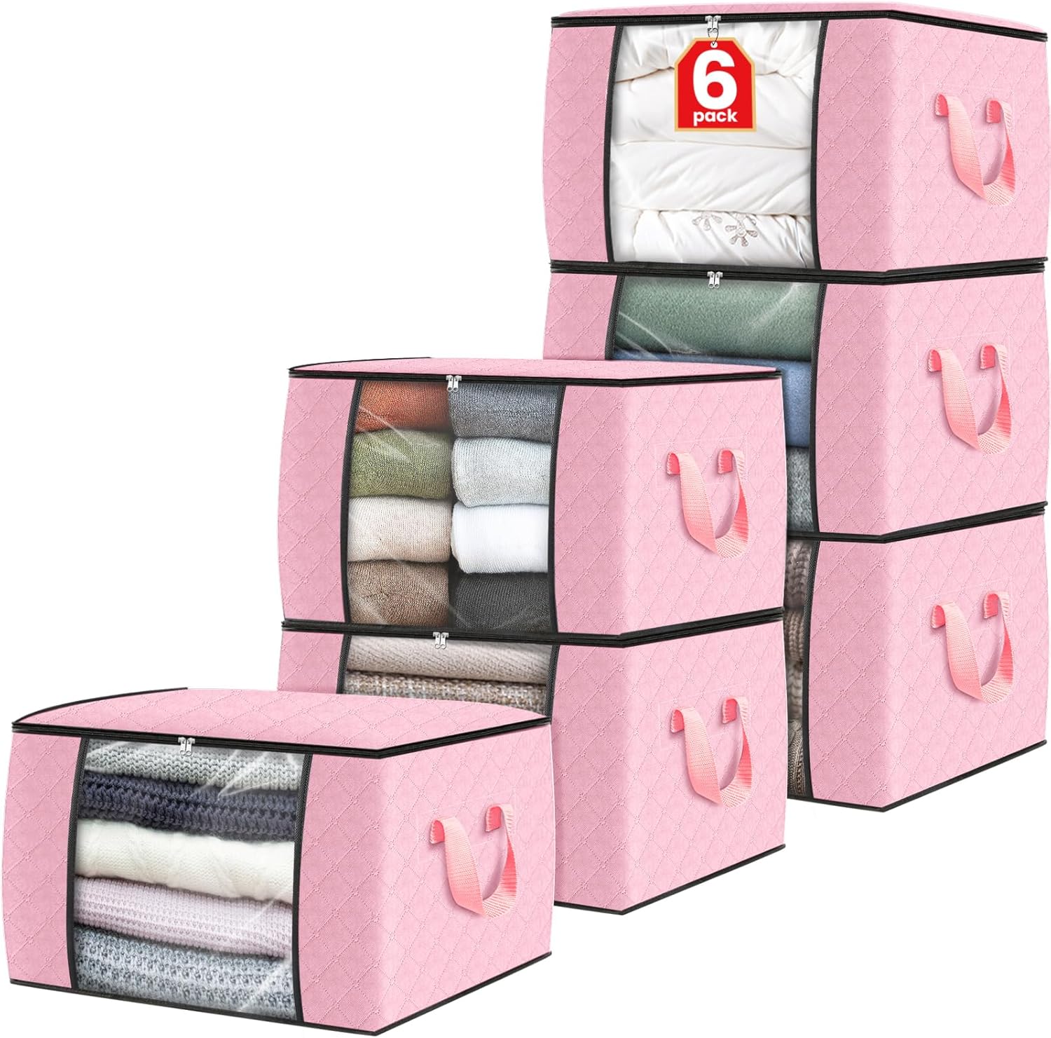 Fab totes 6 Pack Clothes Storage, Foldable Thick Fabric Blanket Storage Bags, Containers for Organizing Bedroom, Closet, Clothing, Comforter, Organization with Handle,Pink